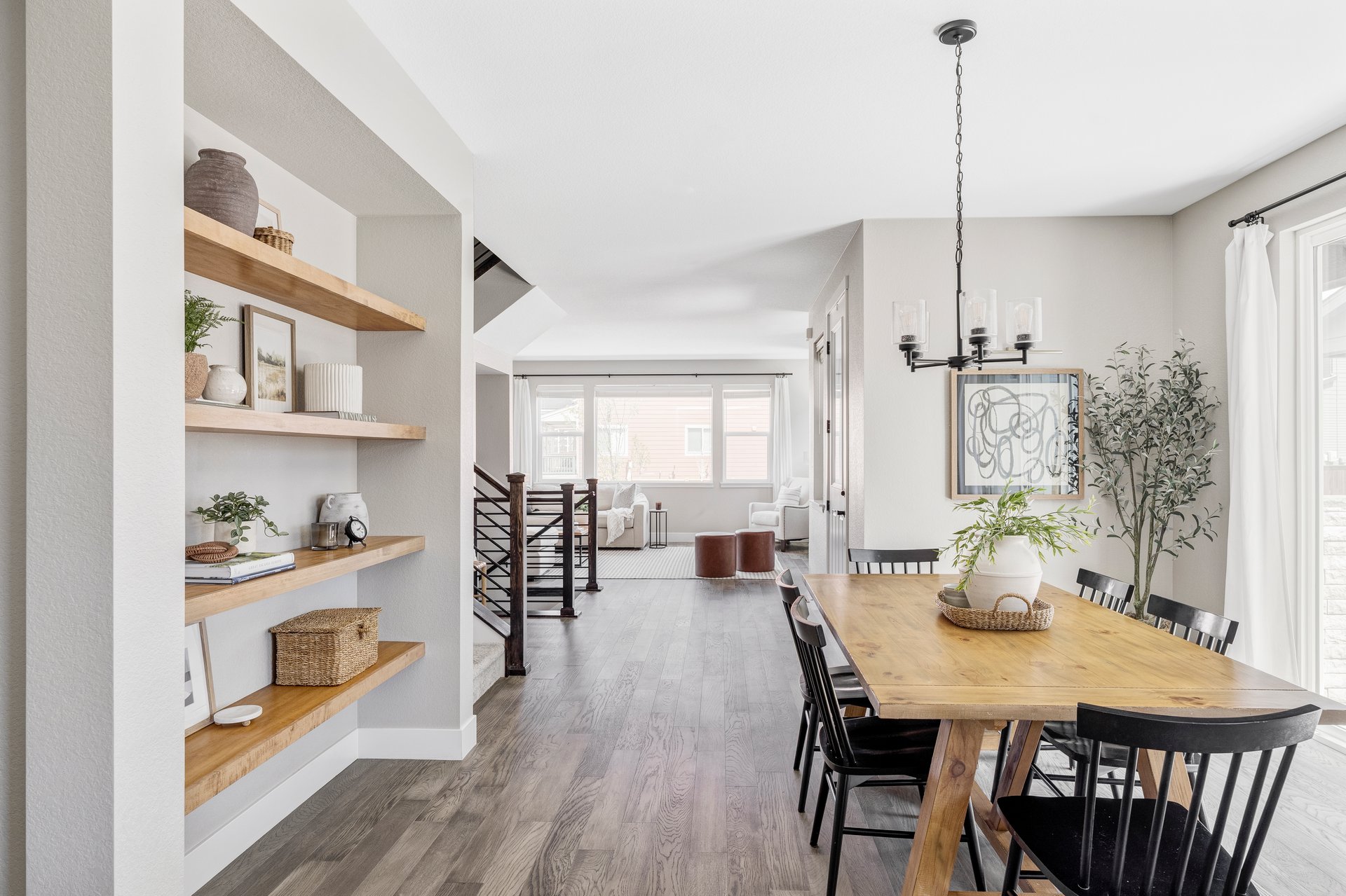 Thoughtful details—like custom floating wood shelving and a moody, designer-inspired powder bath—add personality and elevate the entire main level.
