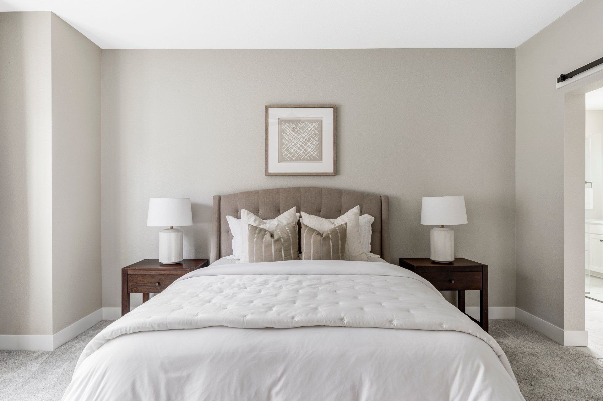 A sliding barn door leads into a spa-like bathroom featuring dual vanities, a walk-in shower, and a spacious walk-in closet. It’s designed to feel both elevated and comfortable.