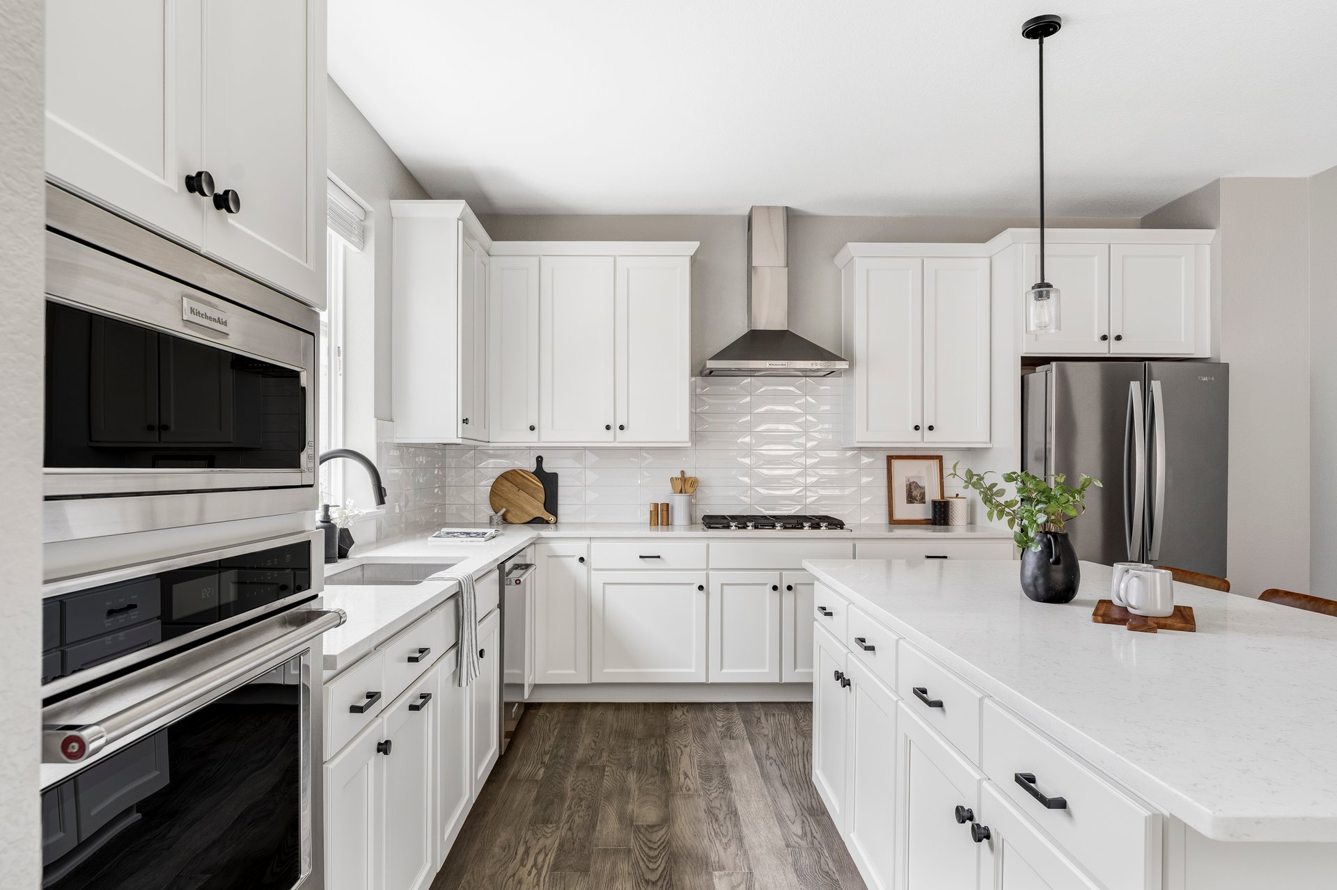 The kitchen is where style meets practicality. Crisp white cabinetry, quartz countertops, and stainless steel appliances create a timeless look, while the gas range and statement hood add a touch of sophistication.