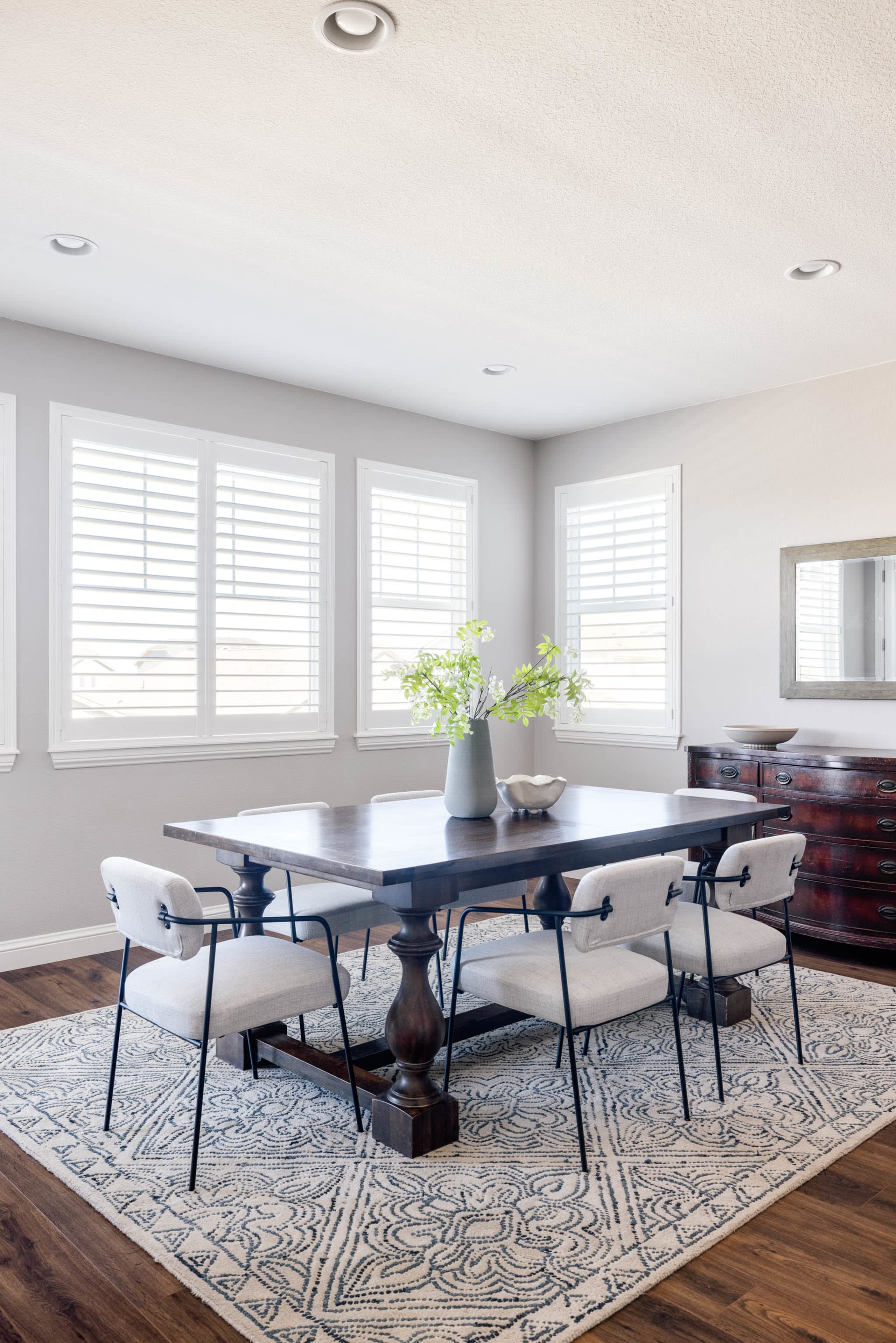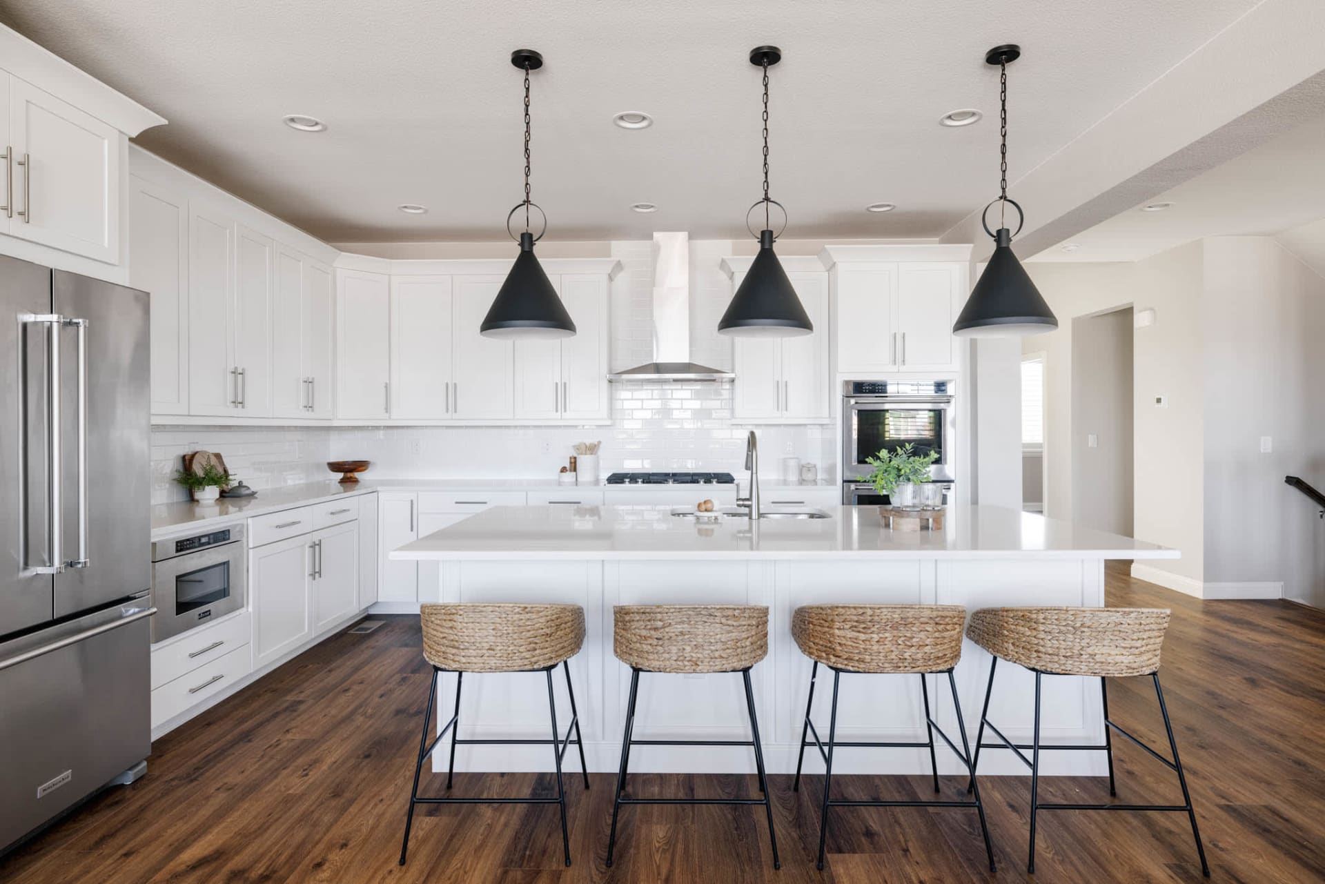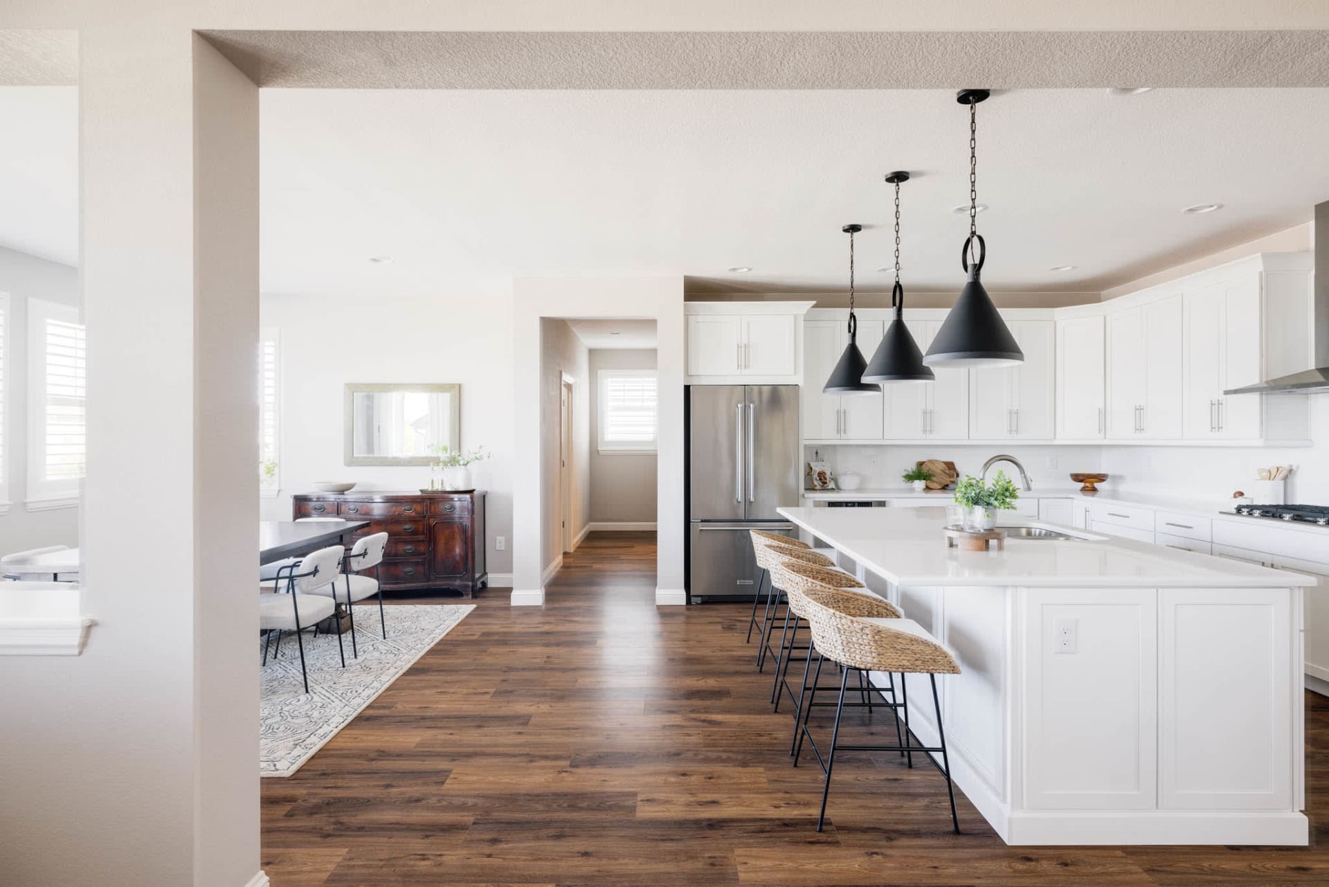 The kitchen features plentiful white shaker cabinetry, stainless steel appliances (including double ovens and a gas range), quartz countertops, stylish white subway tile, and black statement pendant lighting. The oversized pantry provides ample storage space to stay organized and the adjacent mudroom provides convenient access to the 3-car garage. Entertaining is a breeze as the living area flows naturally to the kitchen and dining space. The large formal dining room opens up to a covered back patio, creating an inviting space for gatherings and relaxation.
