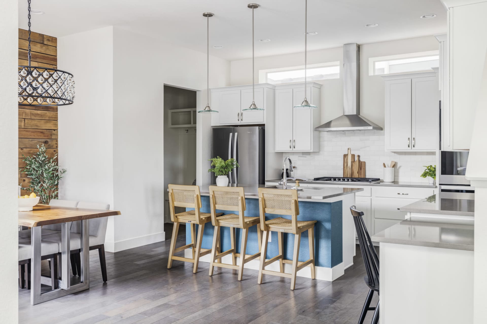 Upon entry push back the french doors to find a spacious light-filled study creating the perfect space to work from home - equipped with a closet you could easily turn this space into a bedroom. Down the hall the home opens up to the living room, centered around a modern gas fireplace lined with marble subway tile and surrounded by decorative built-ins on either side. You can also gain entry to the covered front porch from the living room. Continue to the dining area where you’ll discover a wood lined accent wall and a beautiful statement chandelier.
