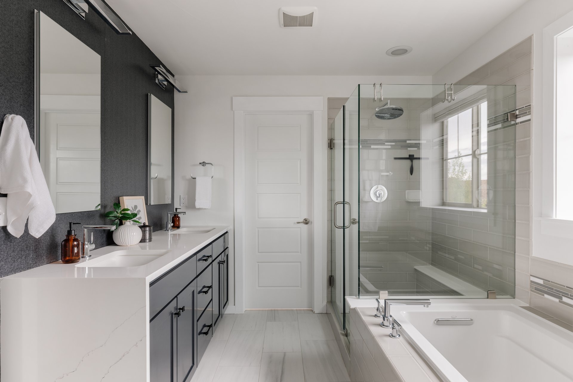 The primary bathroom delivers a spa-like atmosphere with dual vanities, a glass-enclosed shower with a built-in bench, and a soaking tub that creates a true sense of relaxation.