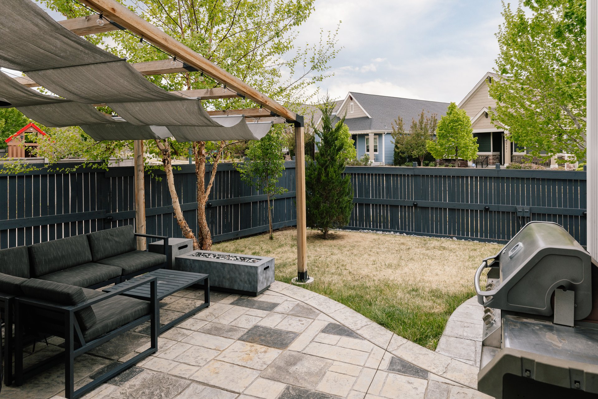 The pergola-covered patio completes the experience, offering a shaded, inviting space for outdoor dining, quiet mornings, or evening gatherings—bringing a sense of resort-style living right to your doorstep.