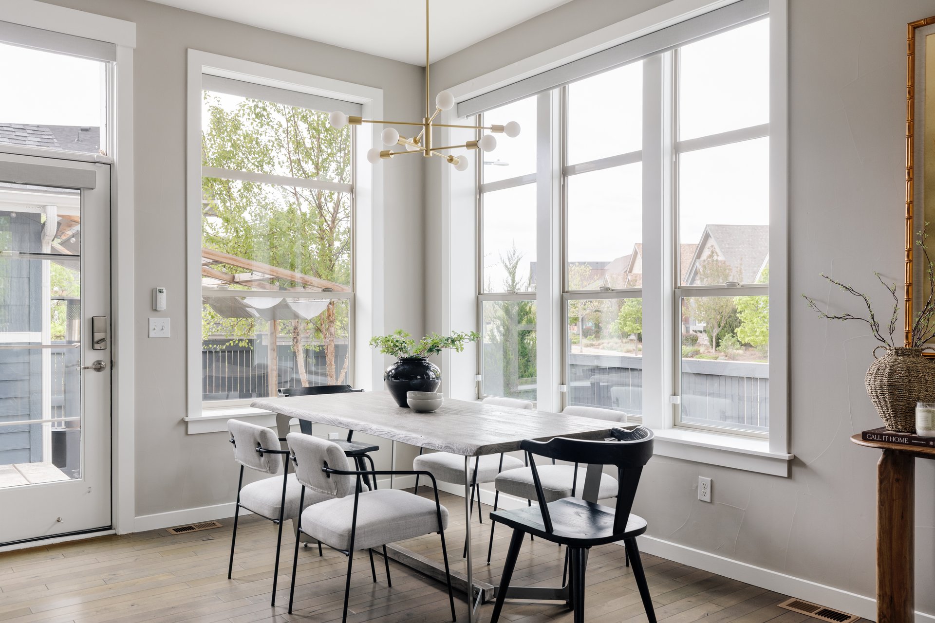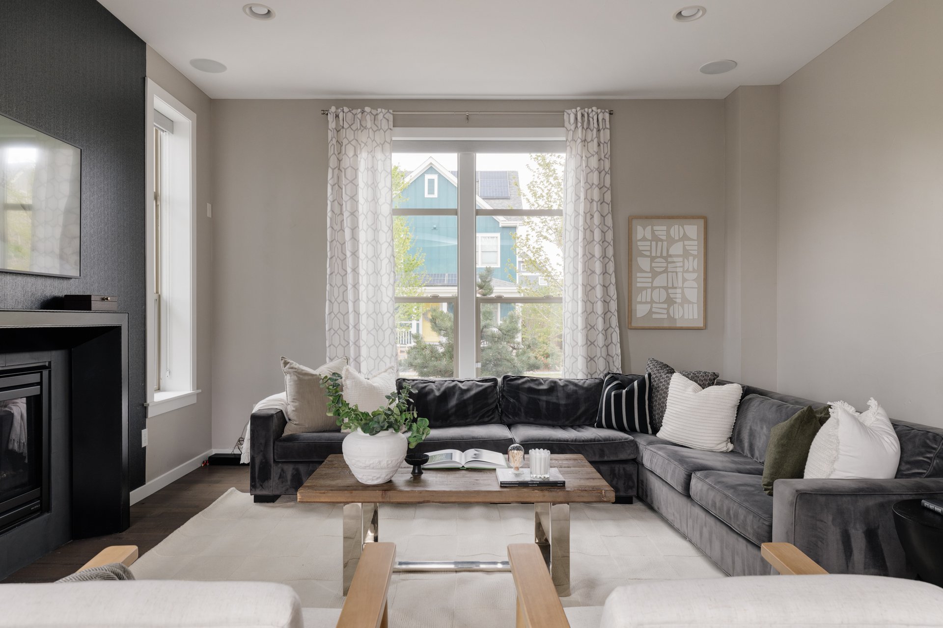 The living room is designed to feel both sophisticated and welcoming. Large windows flood the space with natural light, while wide-plank flooring adds warmth and continuity throughout the main level. A sleek fireplace with a dramatic accent wall anchors the room, creating a clean, modern focal point ideal for both relaxing evenings and hosting guests.