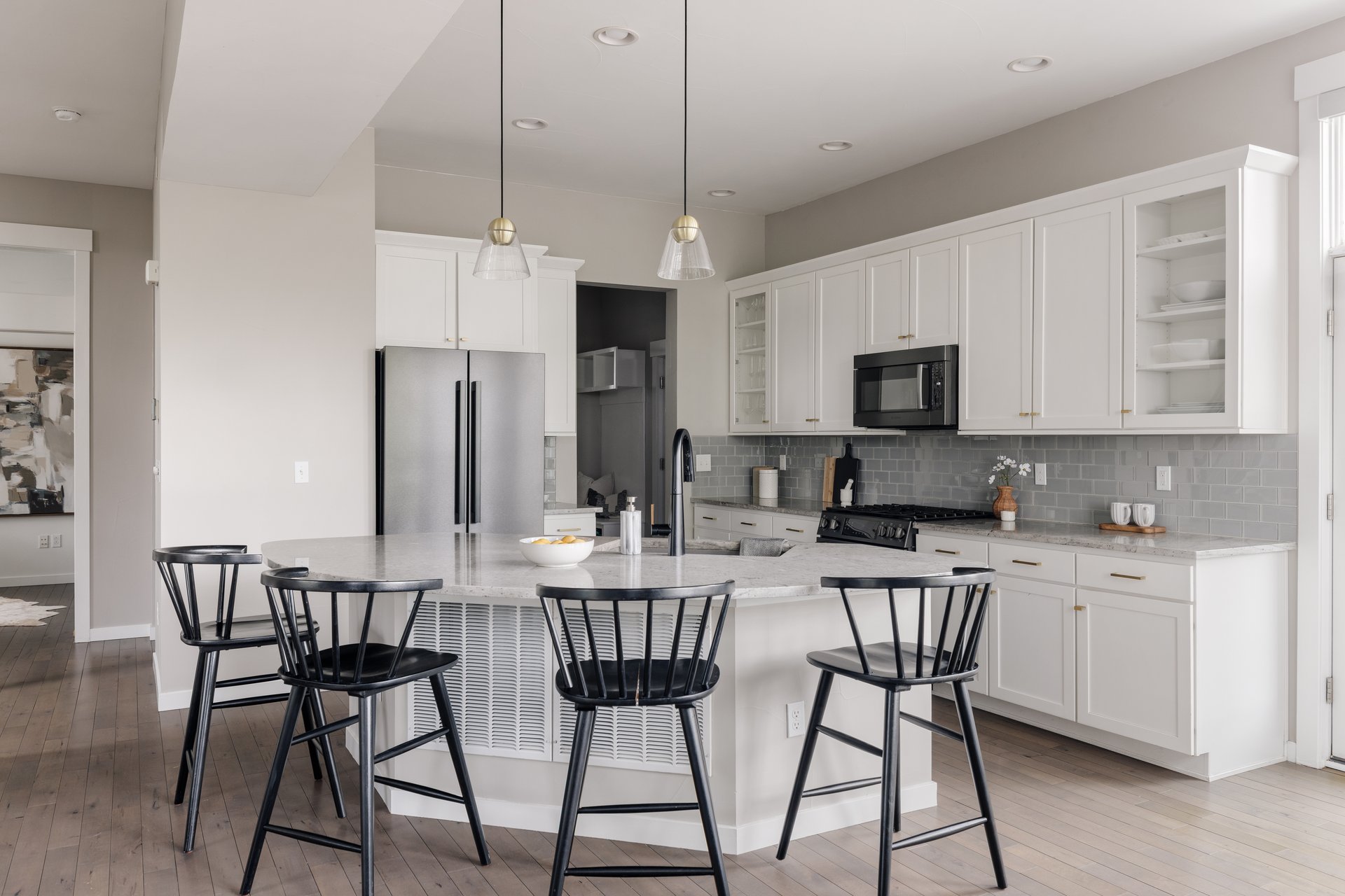 The kitchen is a standout feature—crafted for both everyday living and entertaining. Crisp white cabinetry pairs seamlessly with quartz countertops and a gas range, while a large center island provides ample seating and workspace.