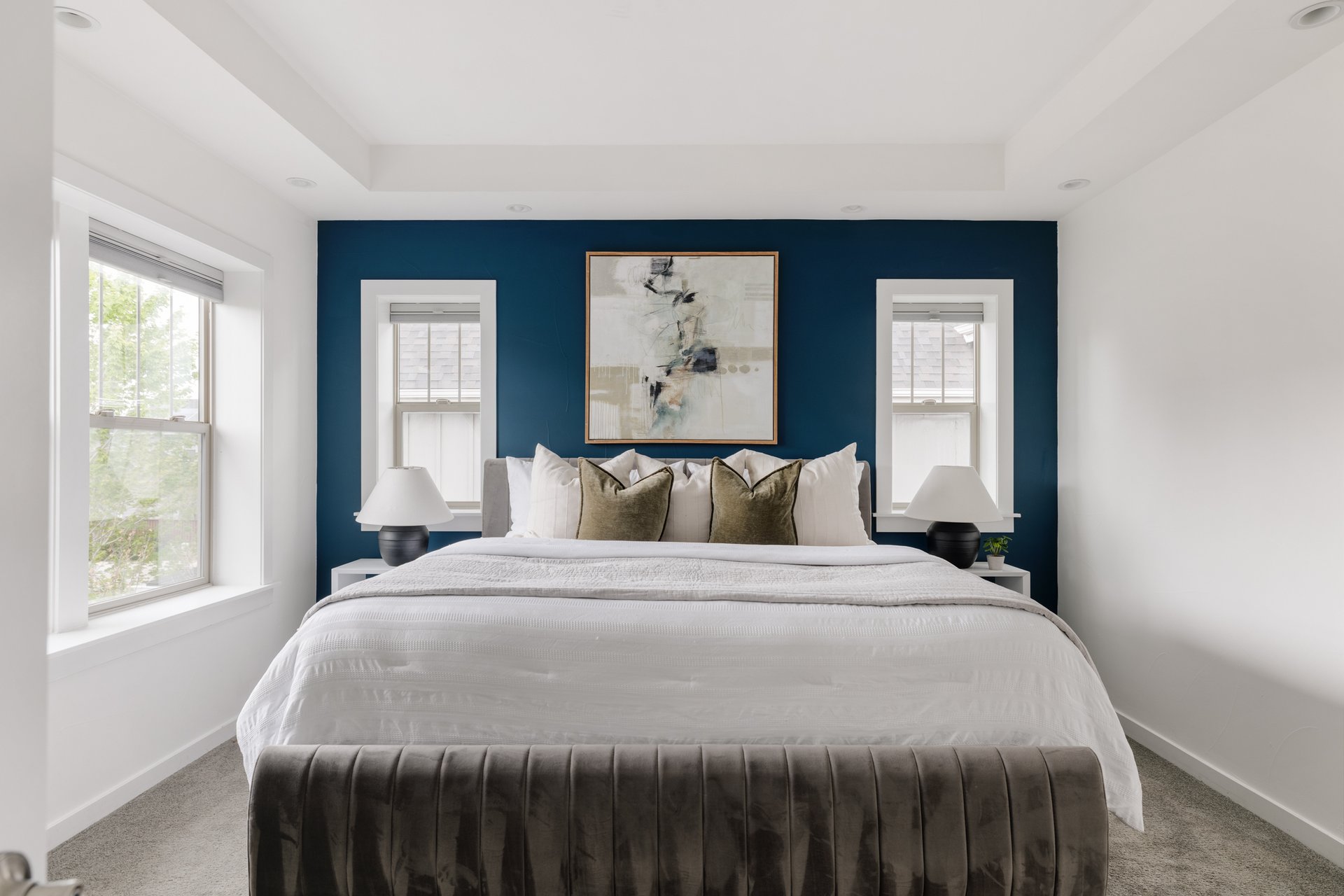 Upstairs, the primary bedroom offers a peaceful escape. Designed with intention, it features a striking accent wall, abundant natural light, and a layout that feels both spacious and serene.