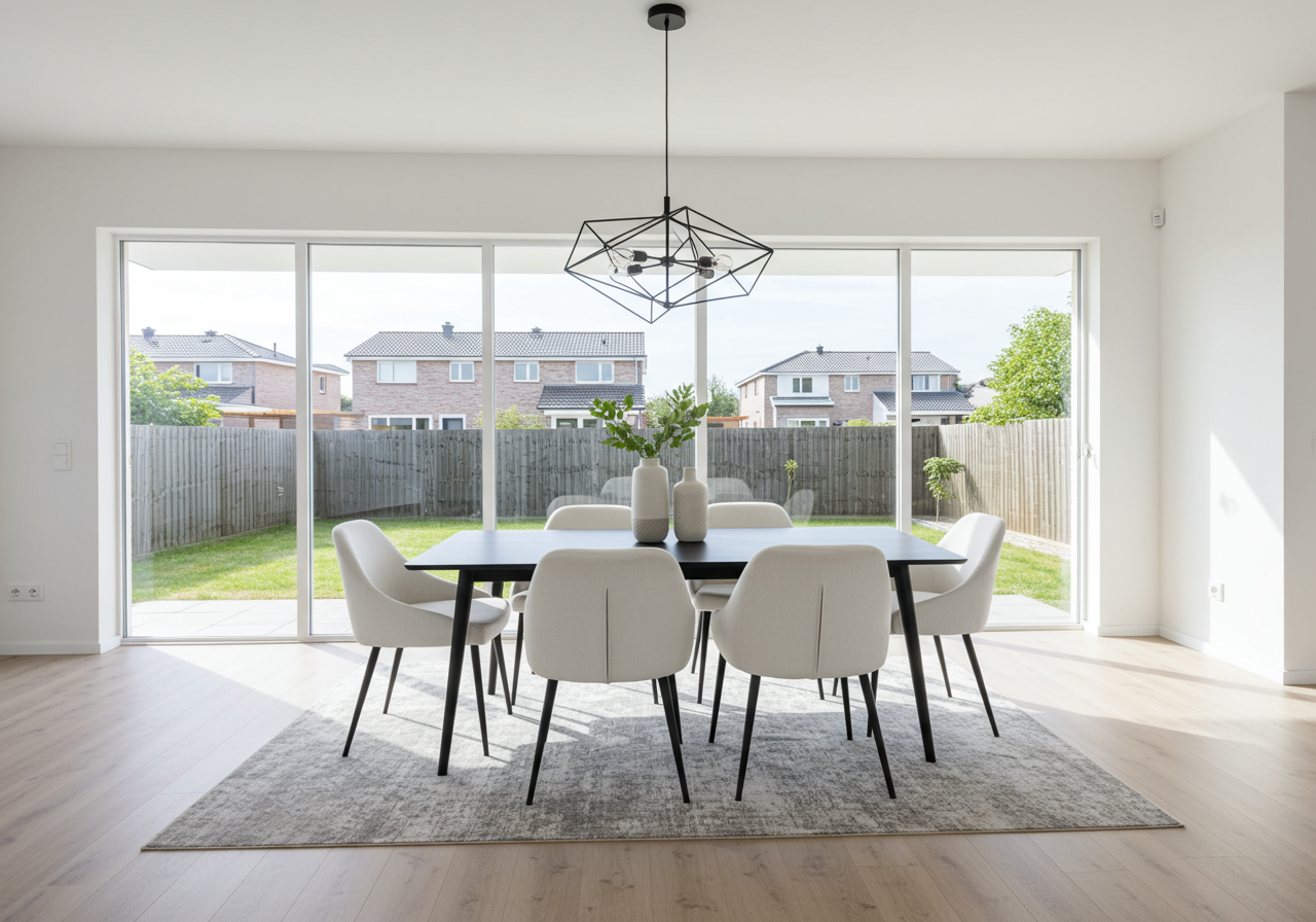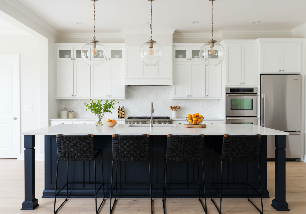 The kitchen, centered around an oversized statement island is equipped with two toned black + white custom cabinets, decorative tile backsplash, chef appliances, and a large walk-in pantry - offering the ultimate space to keep organized. Just off the kitchen is the large dining area, which is centered around a statement chandelier and features a stacked sliding glass door to allow you to invite the outdoors in while hosting gatherings.
