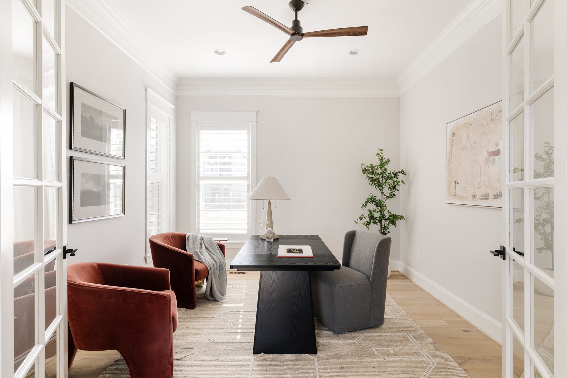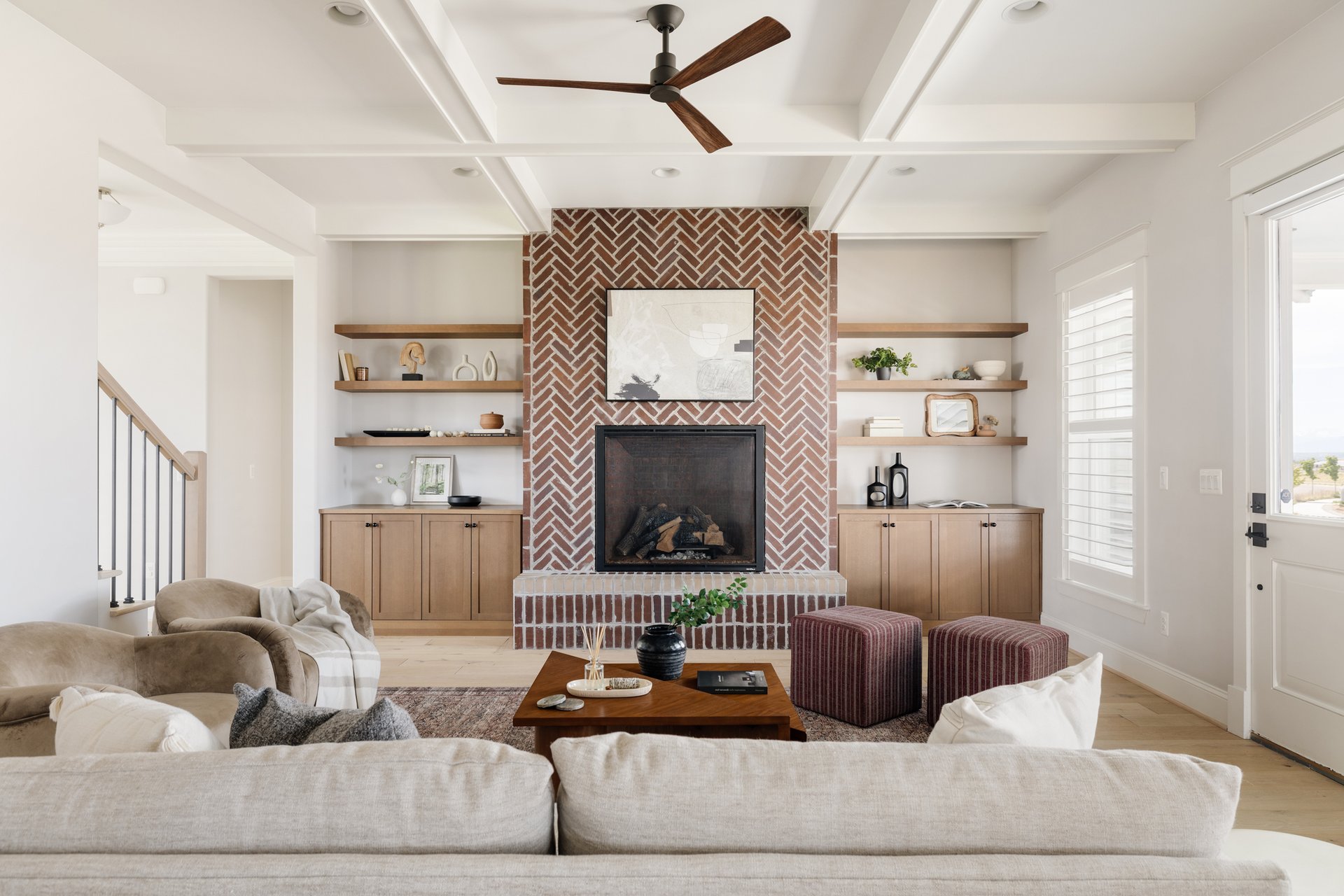 A private study creates the ideal work-from-home space, while the family room features custom built-ins and a striking brick fireplace, adding warmth and architectural character.