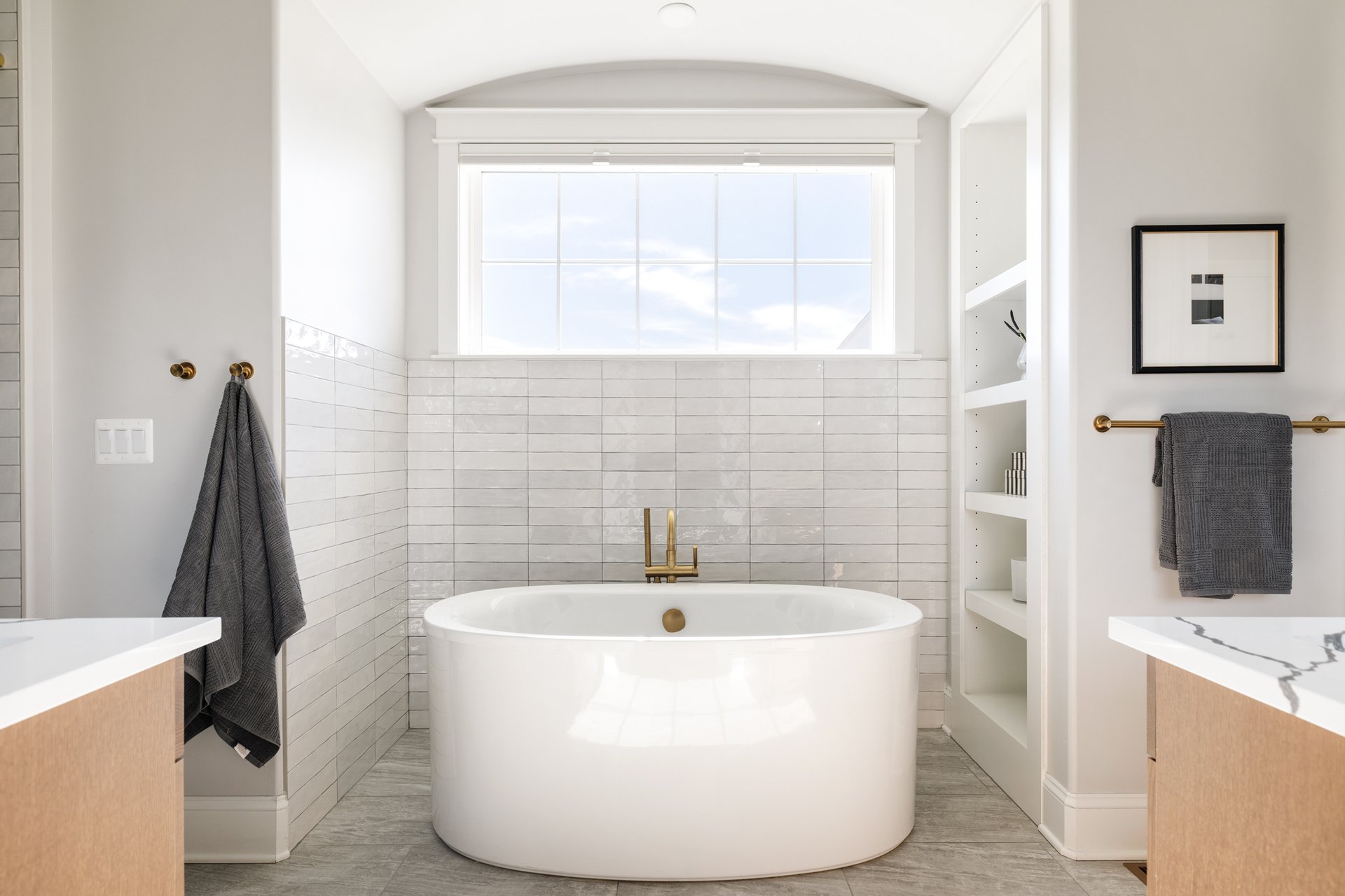 The main level is anchored by a primary suite retreat, offering a spa-like experience with a soaking tub, custom tile shower, and a spacious walk-in closet with built-in organization—plus future-ready plumbing for an in-suite washer and dryer. It’s a layout that prioritizes both comfort and convenience.