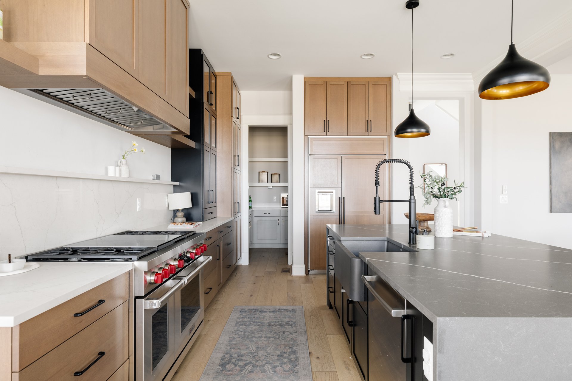 At the heart of the home is a truly standout kitchen—crafted for both everyday living and entertaining at a high level. A 48” Wolf range, custom hood, waterfall-edge quartz countertops, and a built-in refrigerator create a professional-grade experience, while the bold two-toned cabinetry (black and natural wood) adds depth and style.