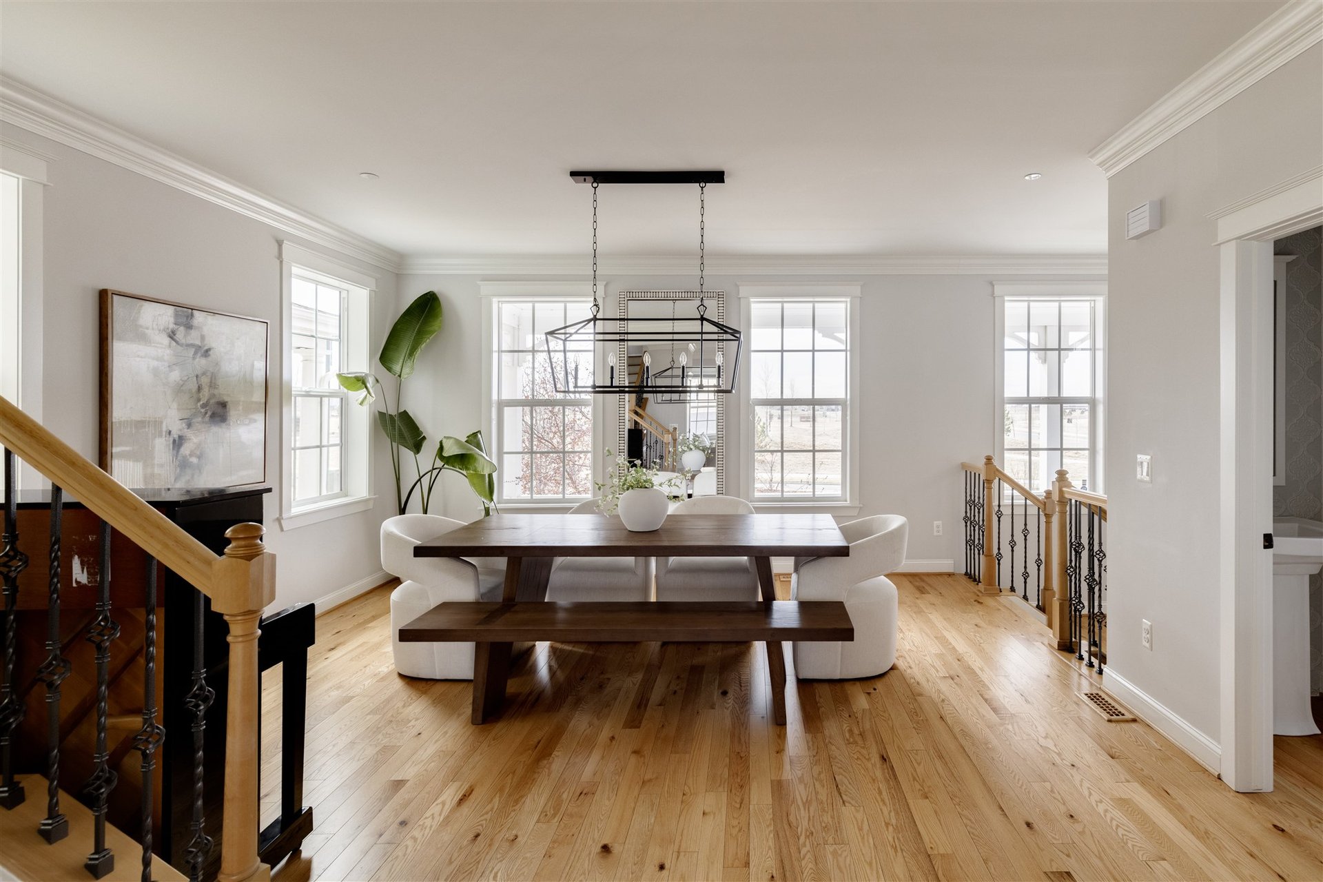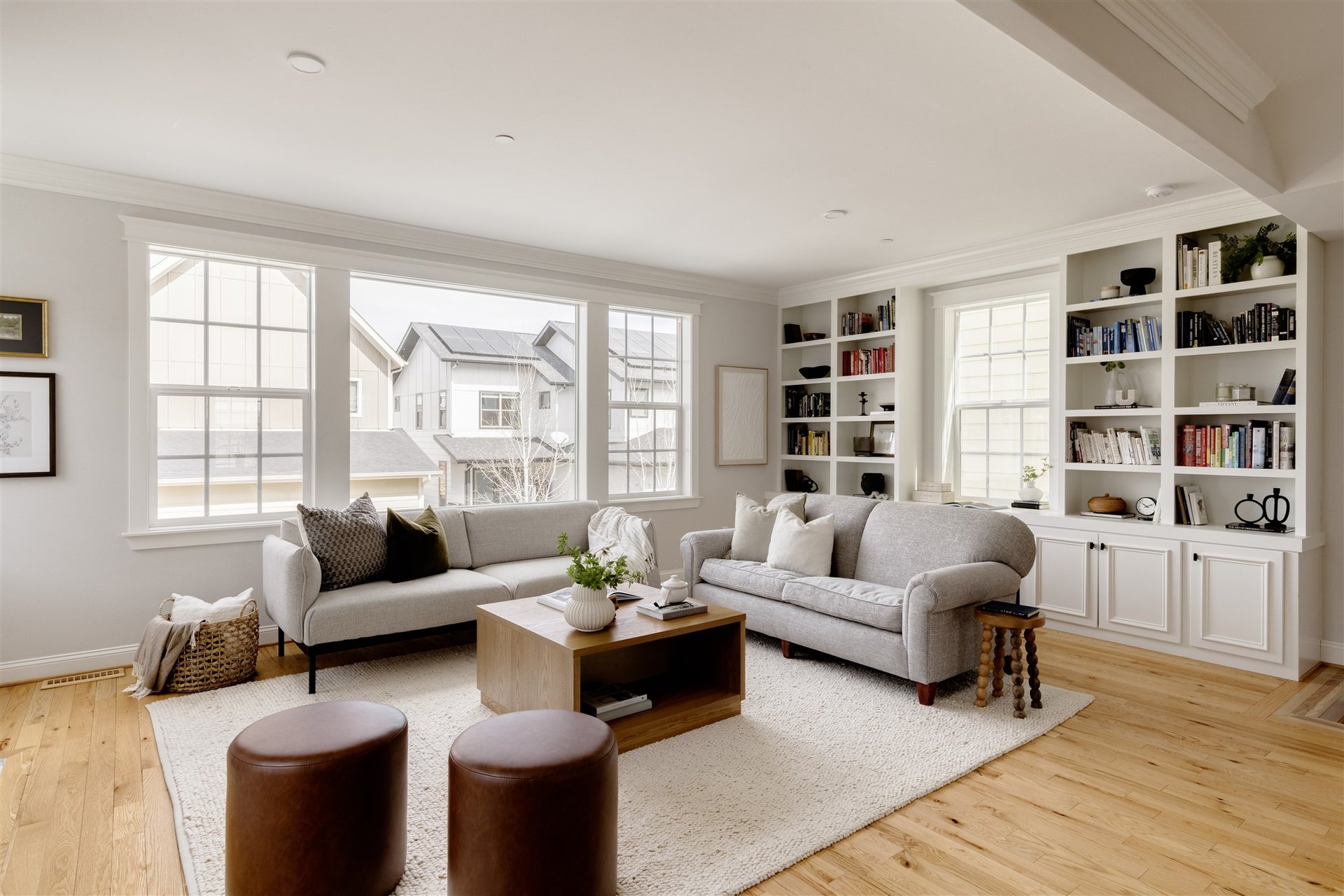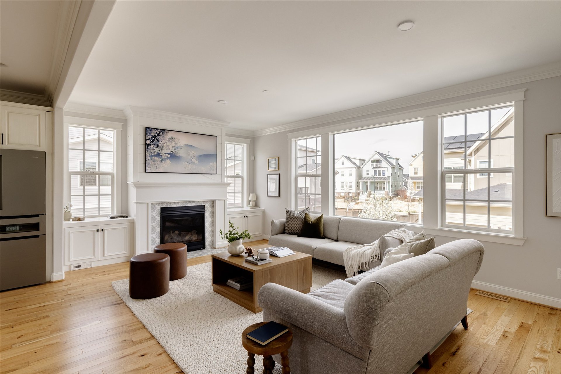 A covered wraparound porch creates an inviting first impression, extending the living space outdoors and offering a front-row seat to open green space and Colorado sunsets. Inside, a spacious foyer opens to a light-filled main level where expansive south-facing windows illuminate the home’s open-concept layout. Hardwood flooring flows throughout, complemented by classic crown molding and a cohesive, elevated design aesthetic.