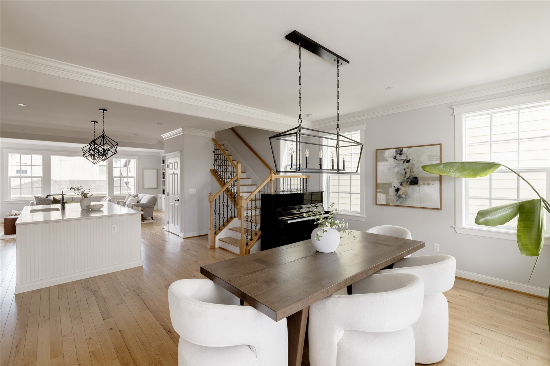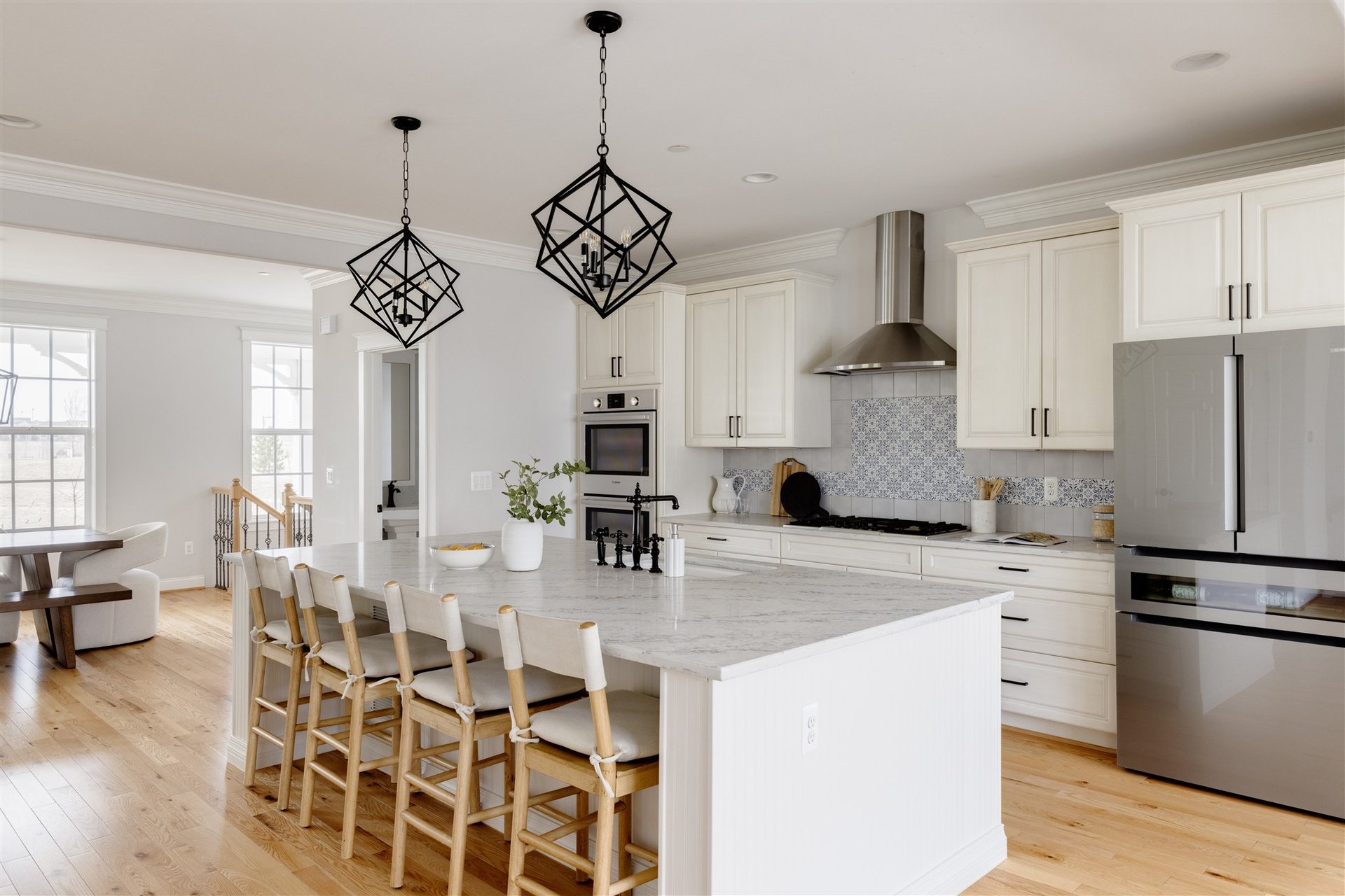 At the center of the home, the kitchen is both functional and refined. White cabinetry is paired with marbled quartz countertops, a decorative tile backsplash, and upgraded appliances, including a brand-new refrigerator. A statement island wrapped in beadboard, topped with designer pendant lighting, anchors the space and provides generous seating. Thoughtful details such as slide-out drawers maximize storage and enhance everyday functionality.