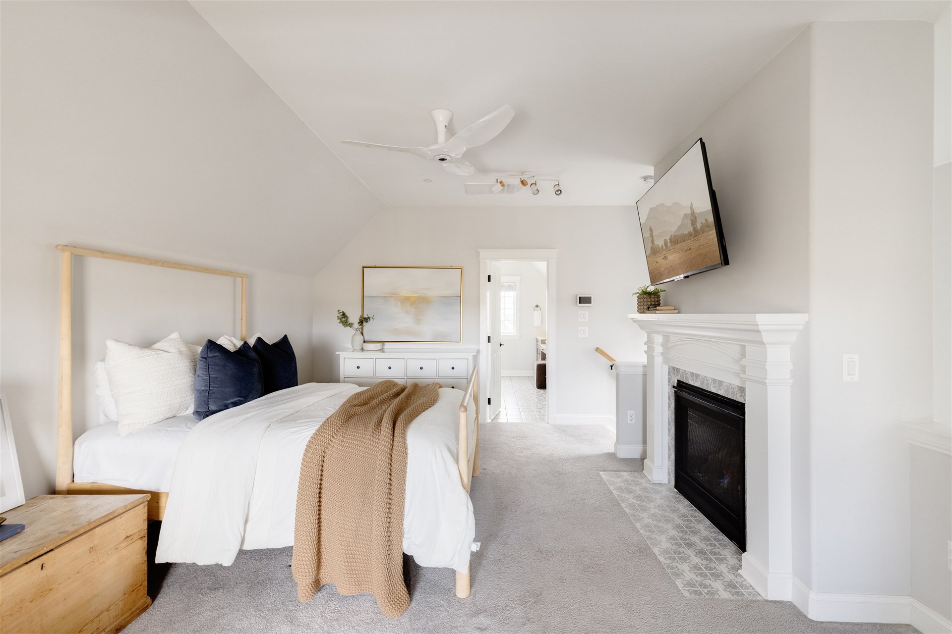 The top floor is dedicated entirely to the private primary suite, creating a true retreat. Vaulted ceilings enhance the sense of space, while a second gas fireplace adds warmth and character. French doors open to a private balcony where unobstructed mountain views elevate both morning and evening routines. The en suite bathroom features dual vanities, a walk-in shower, and a spacious closet designed for both comfort and functionality.