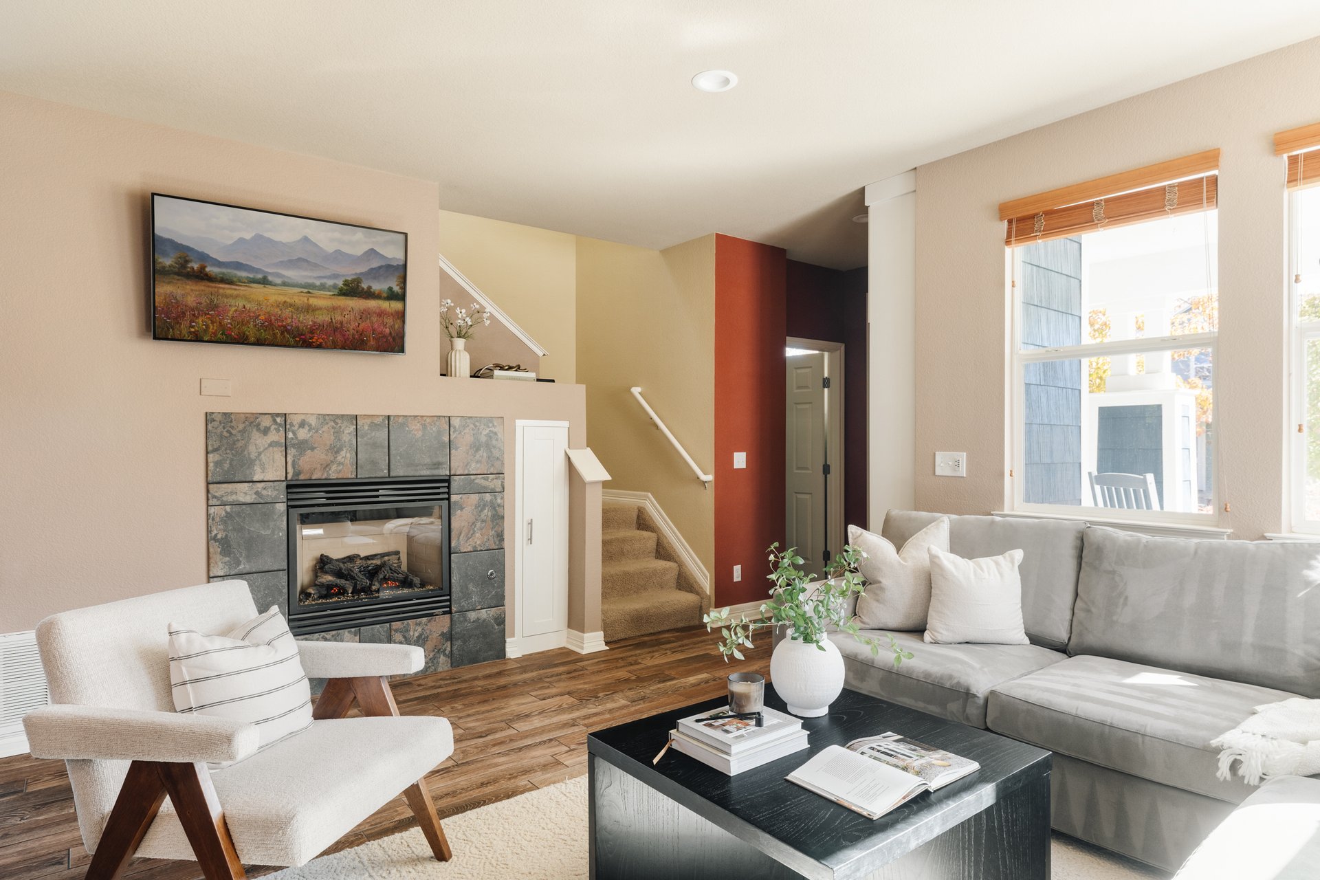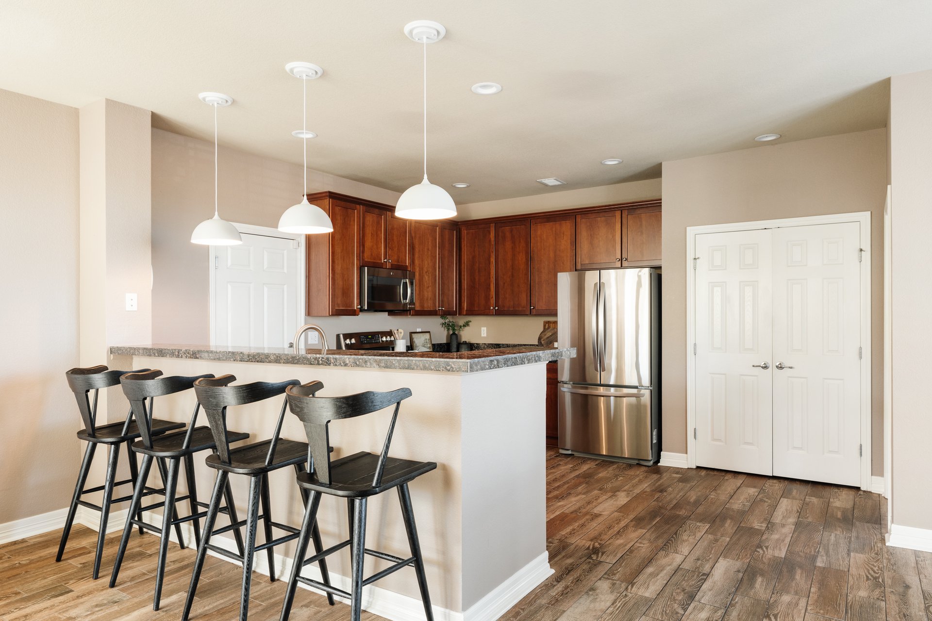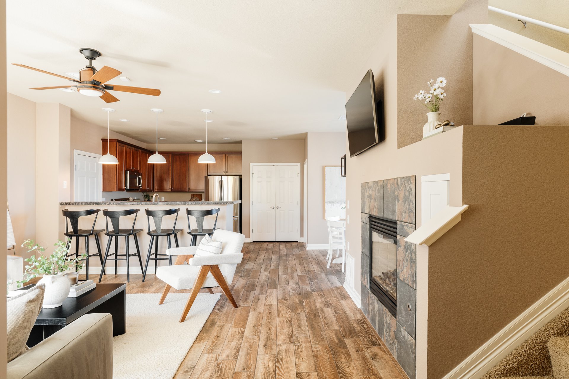 Stepping inside, you’ll find premium wood-look tile flooring flowing throughout the main level—an elegant backdrop to the open and airy floor plan.