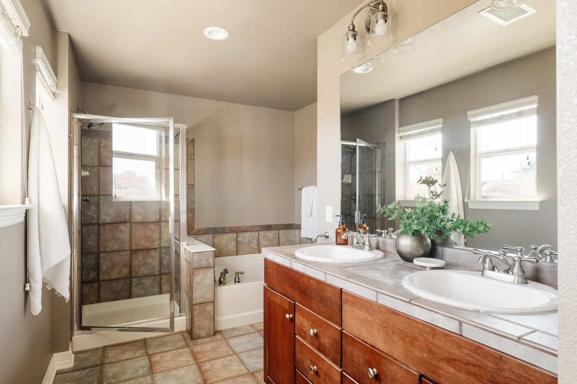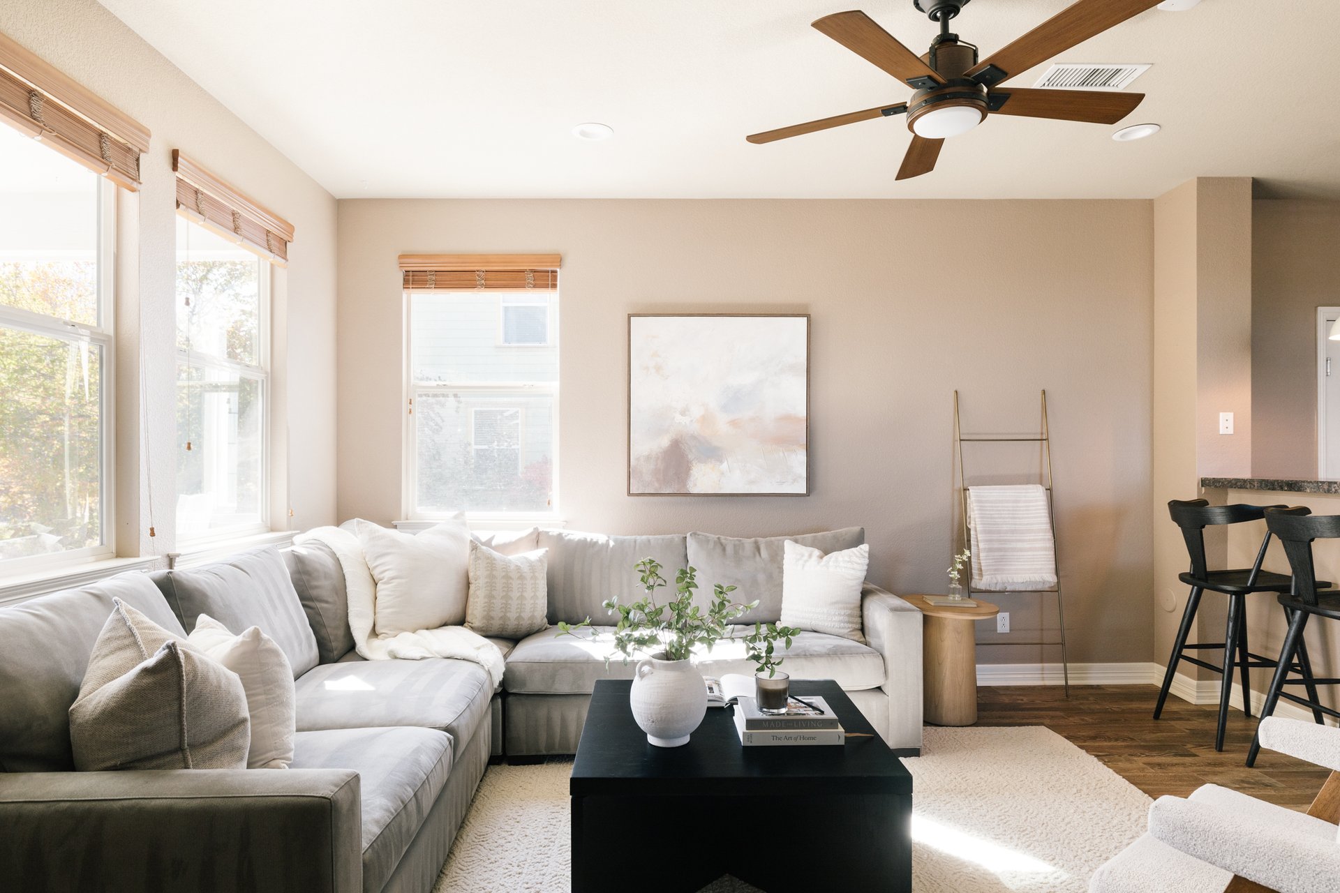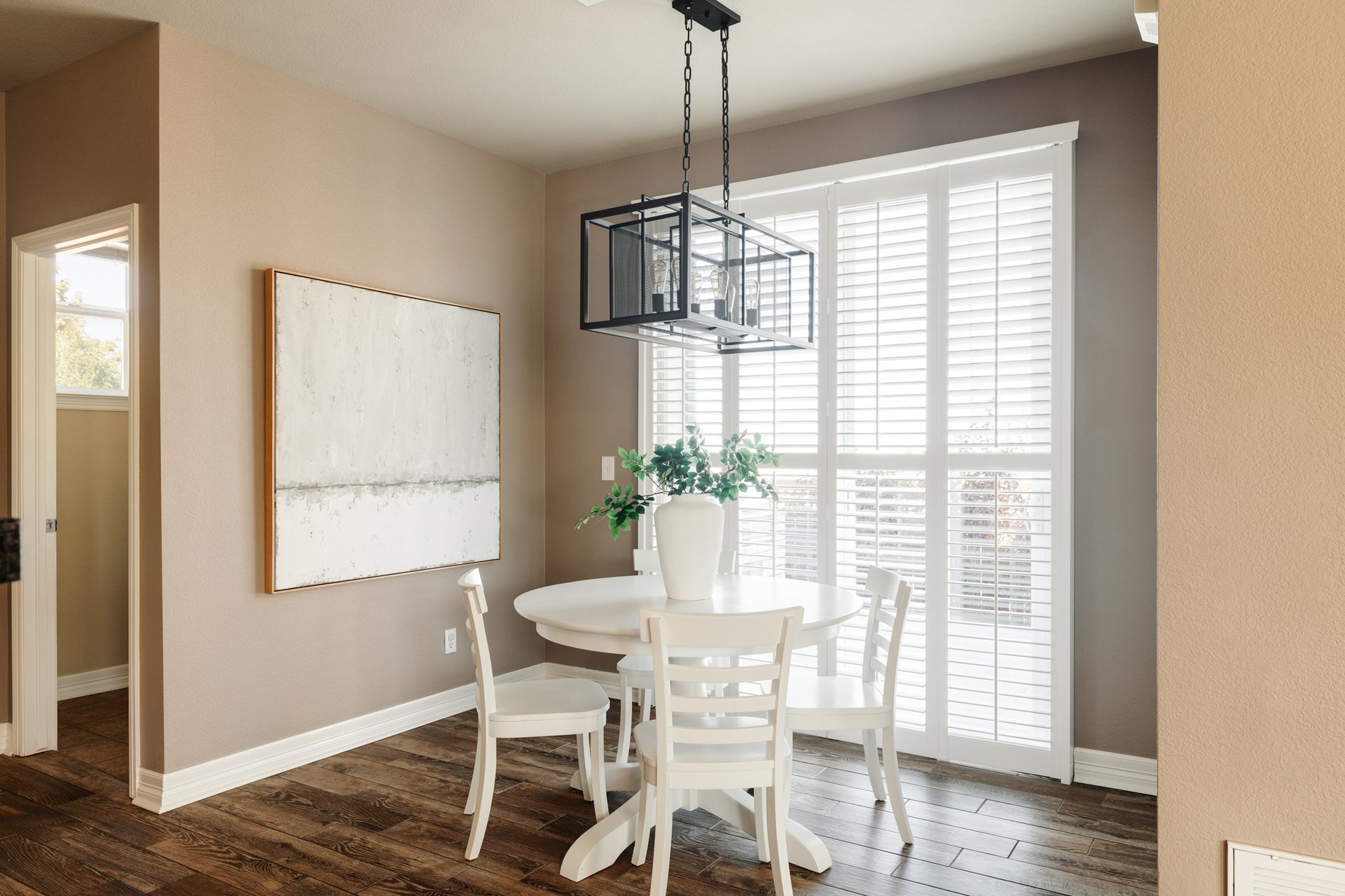 Stepping inside, you’ll find premium wood-look tile flooring flowing throughout the main level—an elegant backdrop to the open and airy floor plan.