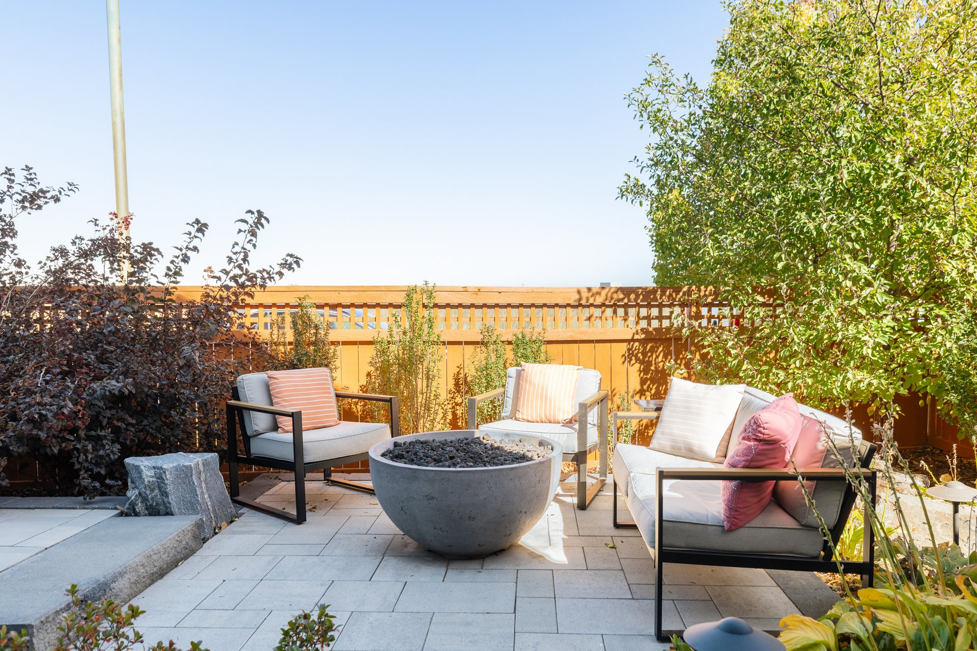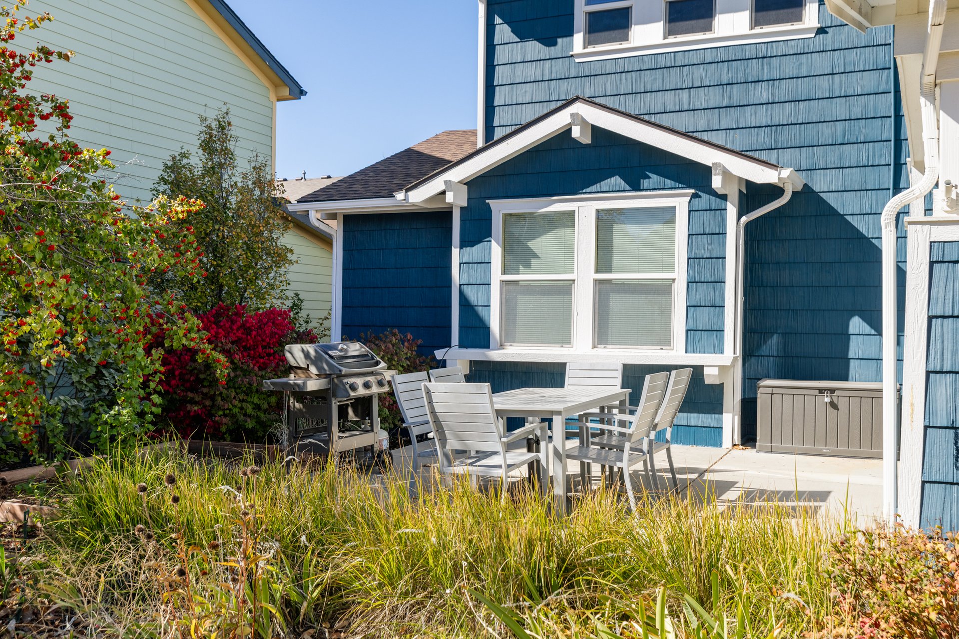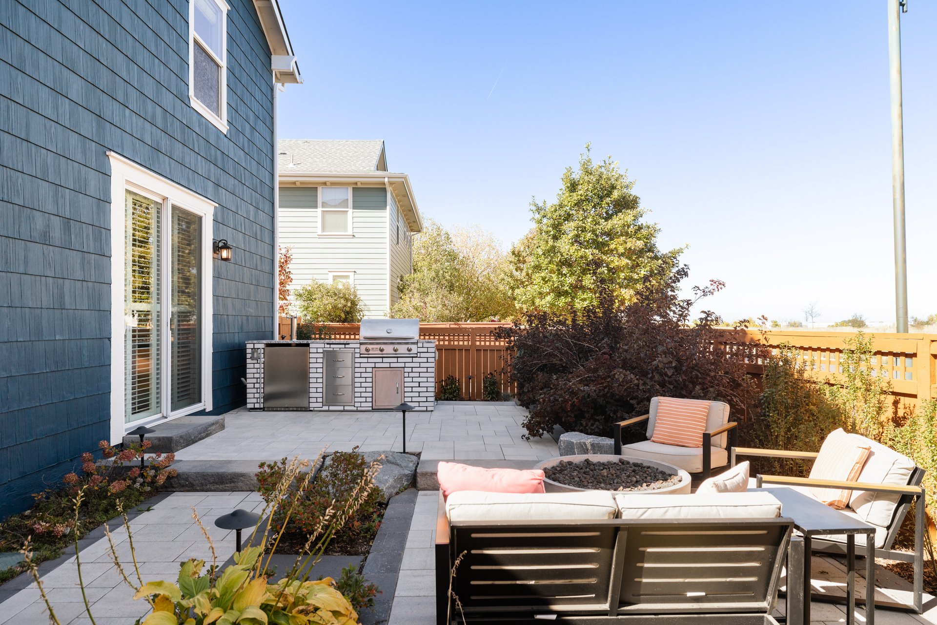 The front patio invites neighborly interaction, while the fully fenced, professionally landscaped rear yard creates a private oasis—ideal for both relaxation and entertainment. Features like built-in grill, fire pit and raised garden beds elevate the outdoor lifestyle.