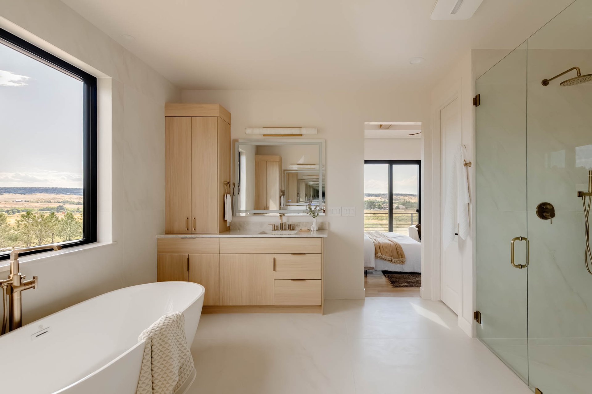 The primary suite is a true retreat, offering wood-beam details, a private balcony with sweeping mountain views, and a spa-inspired bathroom. Here, you’ll find double vanities, a European soaking tub, a walk-in shower, and two generously sized walk-in closets with custom organization—a space designed for both luxury and tranquility.