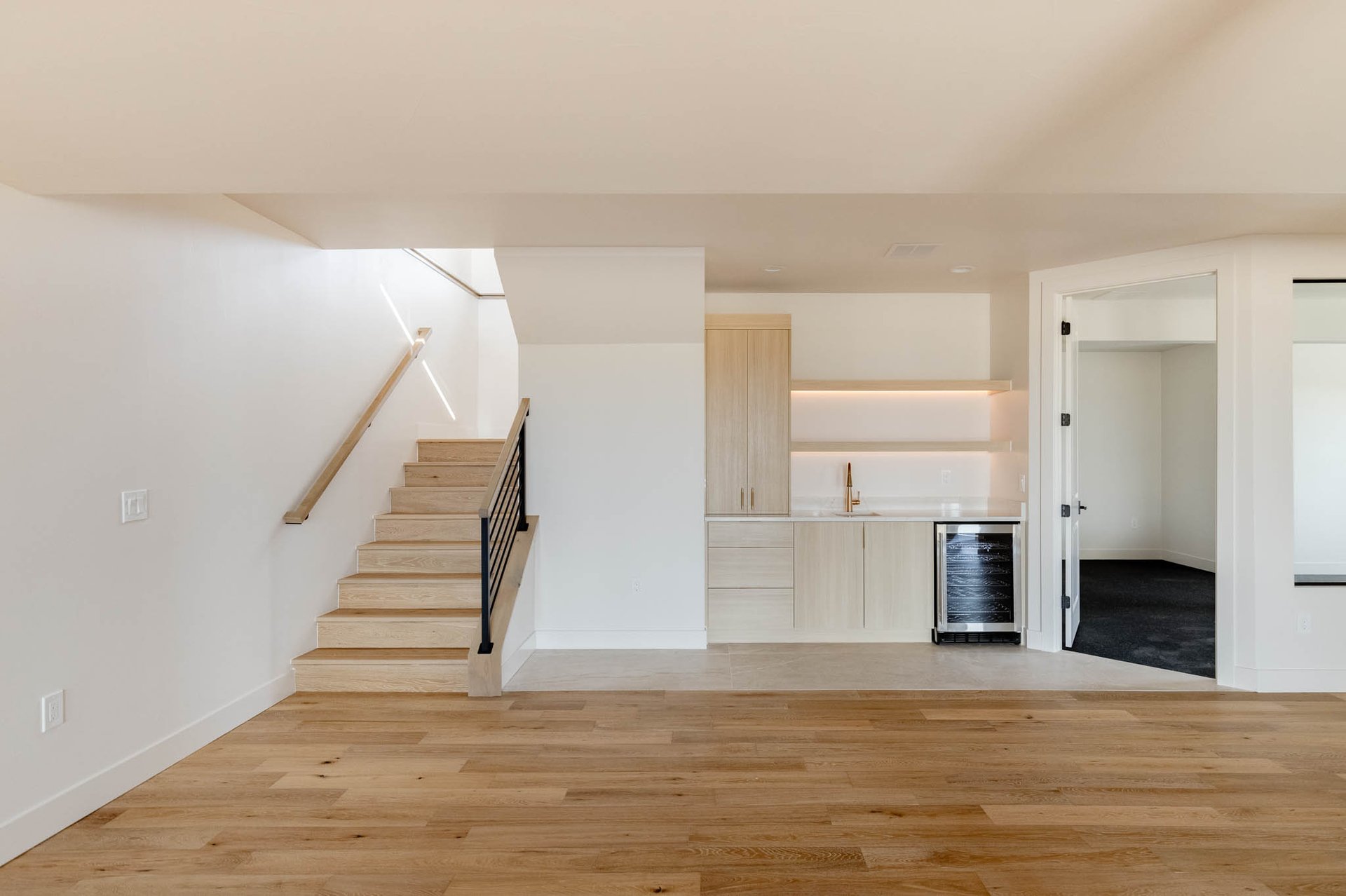 The heart of the home is the open-concept main level, designed for both entertaining and effortless living. The living room, dining area, and gourmet kitchen flow seamlessly together, all framed by European white oak flooring, graceful arches, and custom designer lighting that elevates every space. The dining room, just off the kitchen, features coffered ceilings and statement lighting, making it an ideal setting for intimate dinners or lively gatherings.