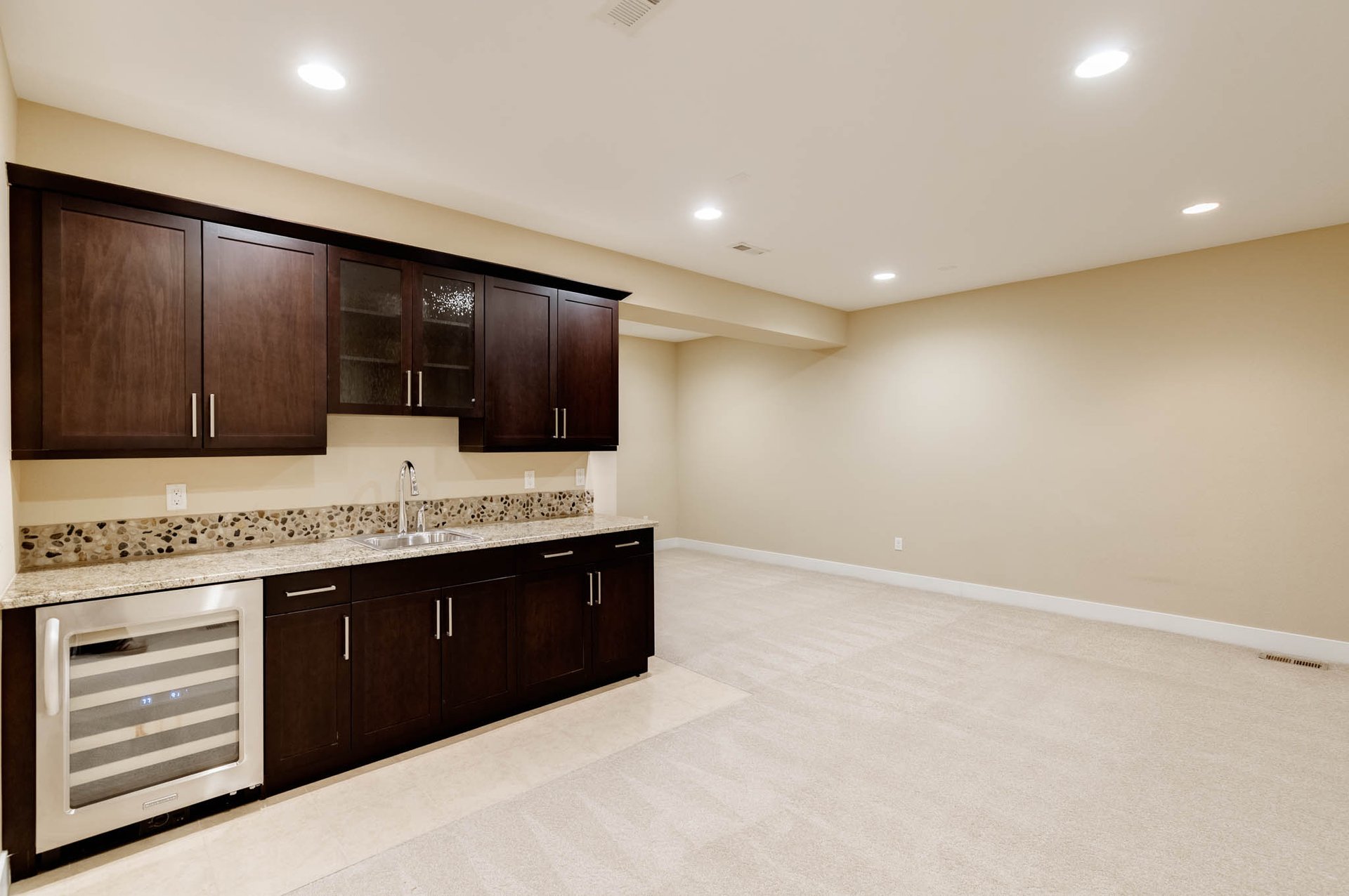 The fully finished basement extends the home’s functionality, transforming it into a space designed for both entertainment and relaxation. A spacious secondary living area is complemented by a custom wet bar, creating an ideal environment for hosting, movie nights, or game days.