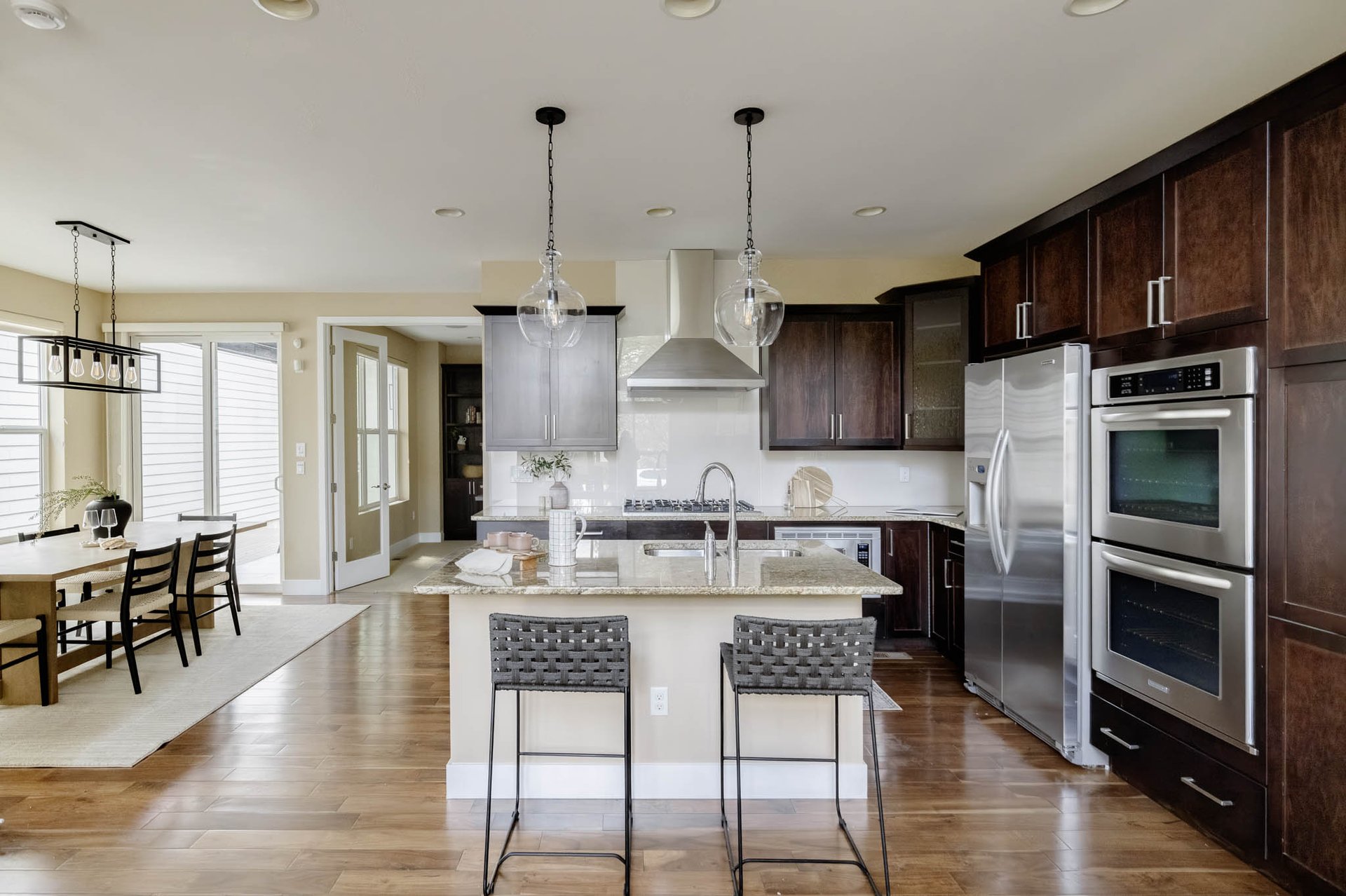 The open-concept layout seamlessly connects the main living areas, creating an effortless flow between the kitchen, dining, and living spaces. At the center, the kitchen is both functional and elevated, featuring rich cabinetry, granite countertops, and a Viking range cooktop that caters to both everyday meals and elevated entertaining. A large center island serves as a natural gathering point, ideal for casual mornings or hosting guests.