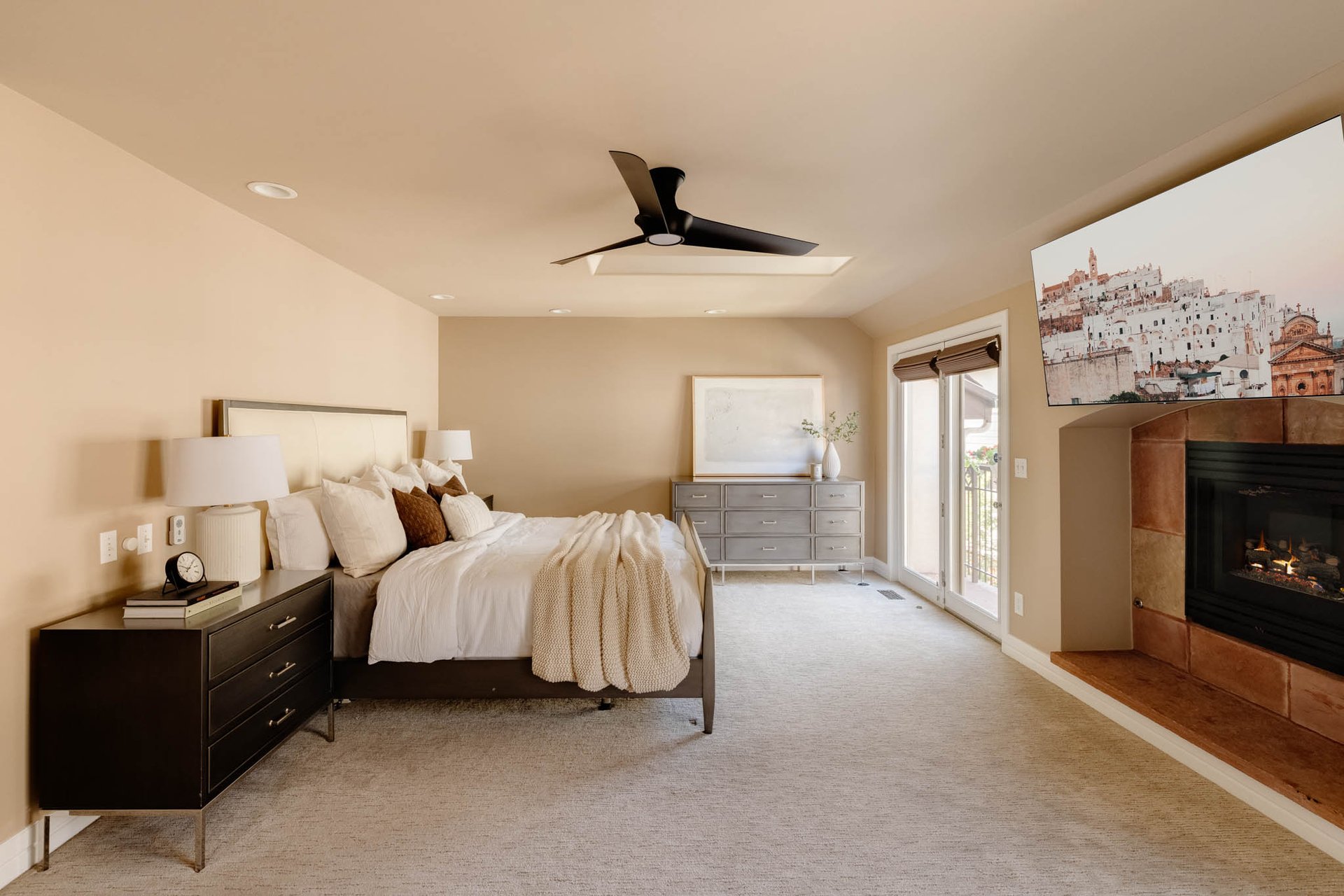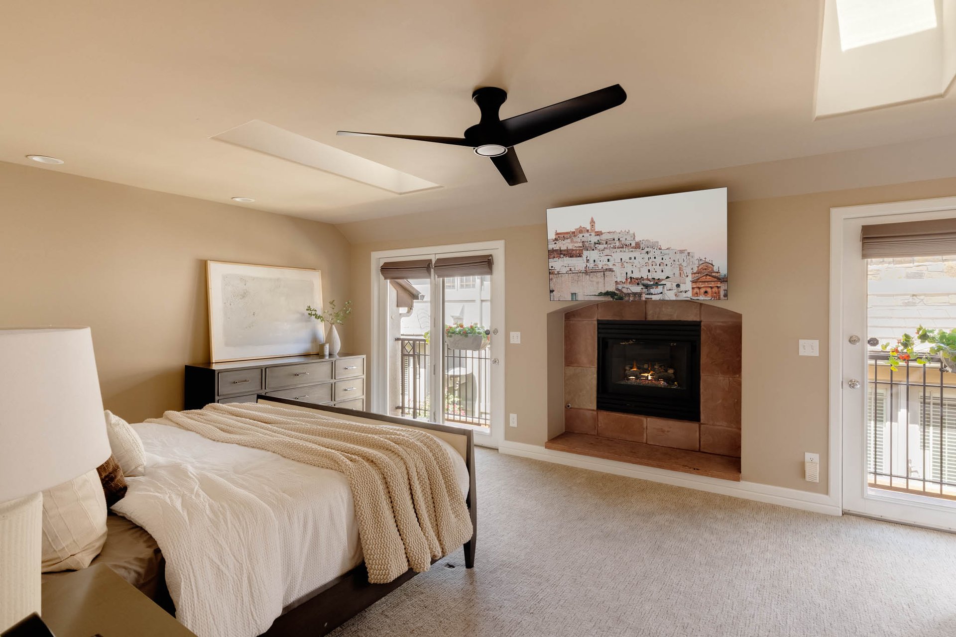 The light-filled living room centers around a sleek modern gas fireplace and opens to a spacious patio, offering the perfect balance of warmth and style. Upstairs, the luxurious primary suite feels like a private sanctuary, complete with skylights, Juliet balconies, a second fireplace, a walk-in closet, and a spa-like five-piece bath. Adding to the convenience, the primary suite includes its own dedicated laundry area.