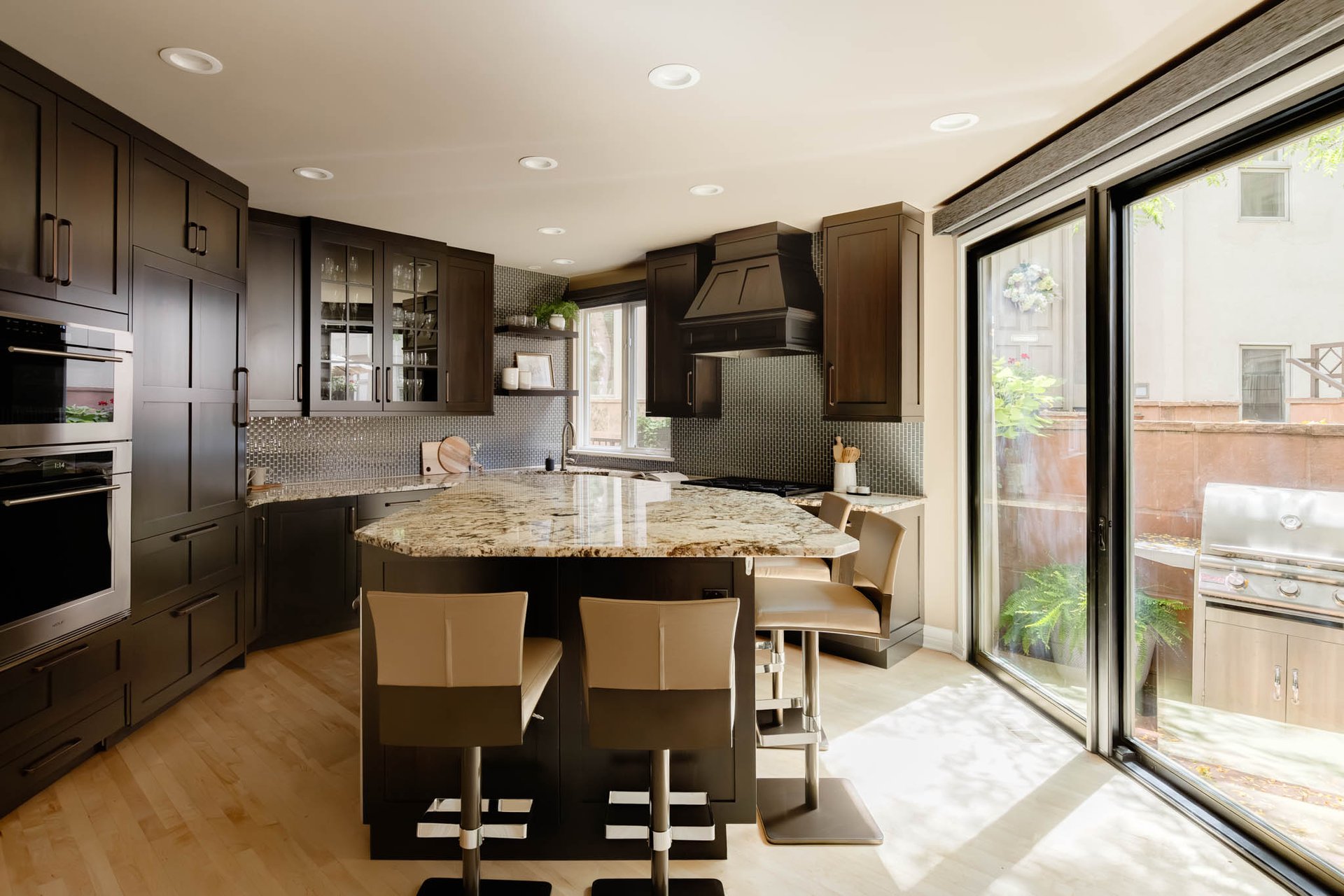 Multiple private patios expand the living space outdoors, each offering its own unique ambiance. New Pella doors with motorized shades provide seamless transitions between inside and out, while the serene front patio—framed by mature Aspen trees—creates a peaceful retreat just steps from the energy of Cherry Creek.