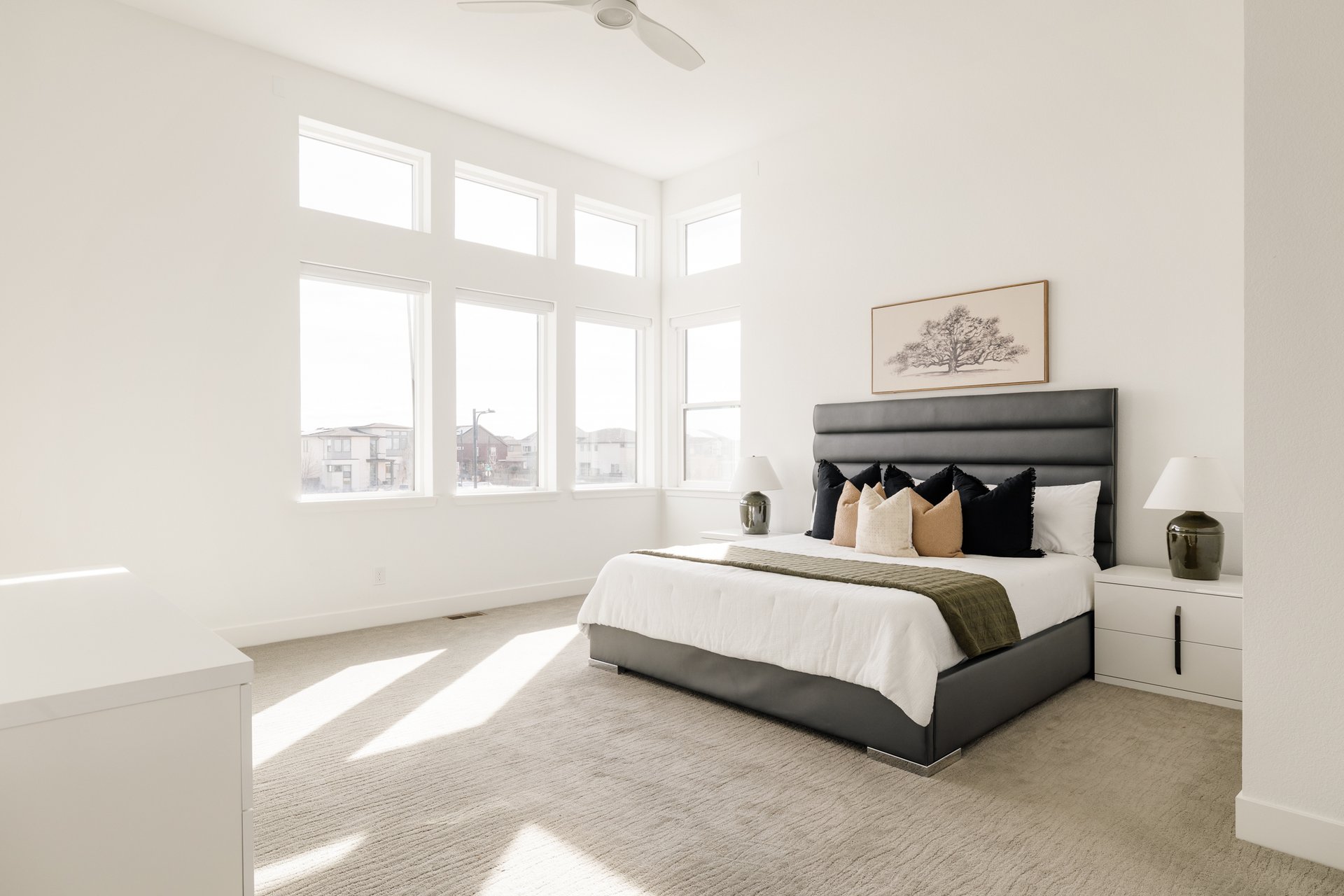 The primary retreat is designed to be both luxurious and restorative. Large windows with motorized blinds create a serene, light-filled atmosphere, while dual walk-in closets with custom organization provide exceptional storage.