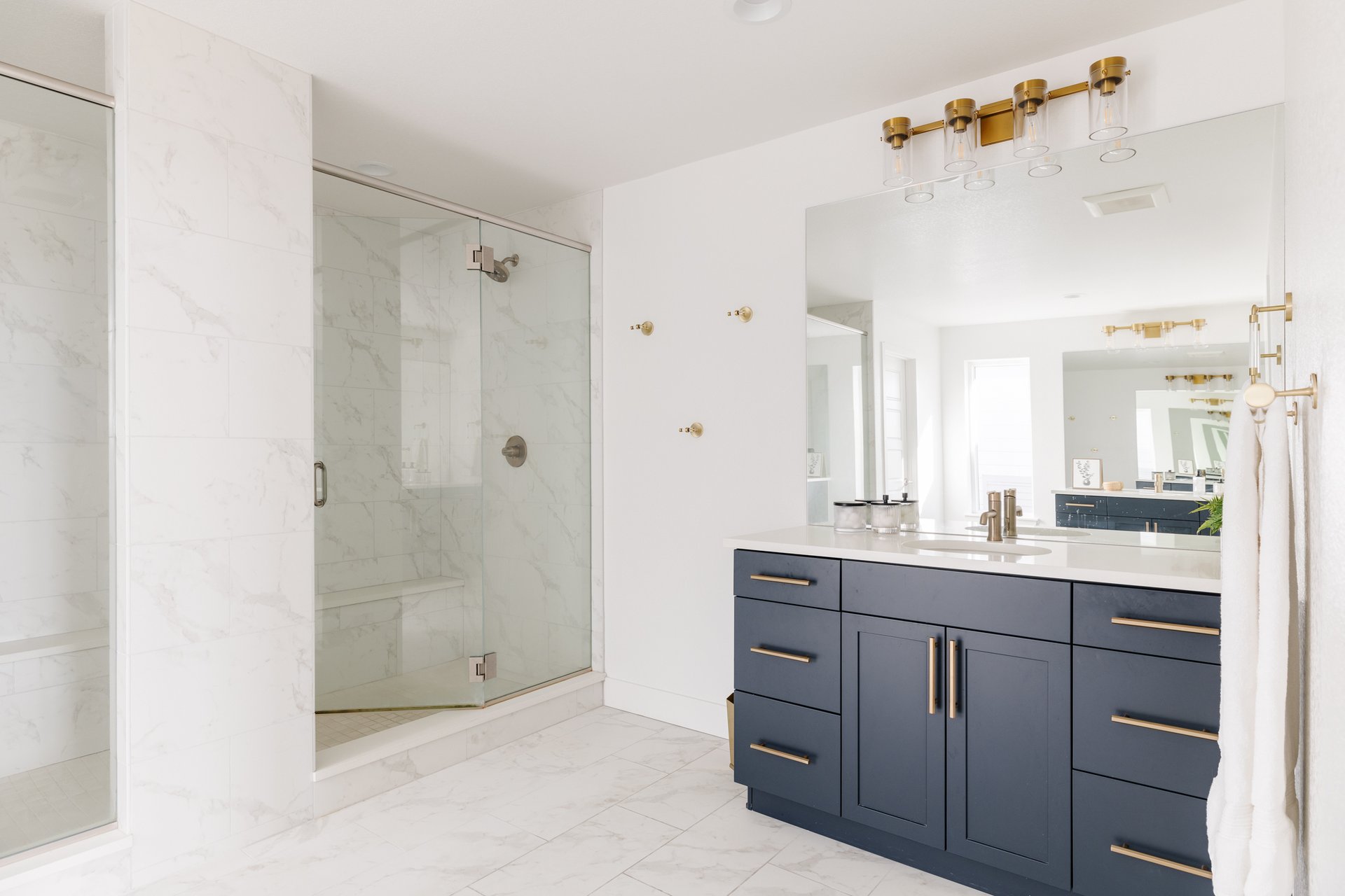 The fully updated spa-inspired bathroom features double vanities, refined finishes, and an oversized walk-in shower, offering a daily escape that feels both elevated and indulgent.