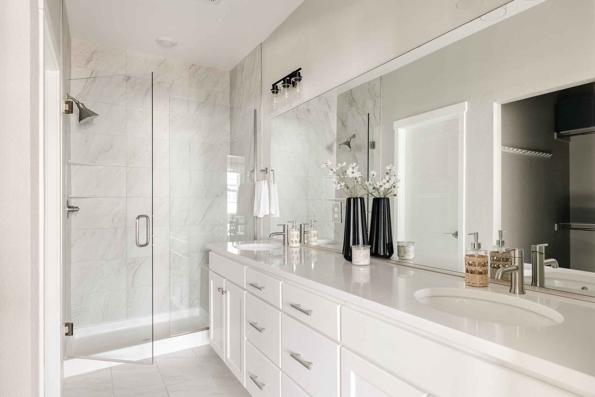 The primary suite is a true retreat, featuring a generous walk-in closet and a spa-inspired en-suite bathroom complete with dual sinks and a sleek glass-encased shower — the perfect place to unwind after a long day.