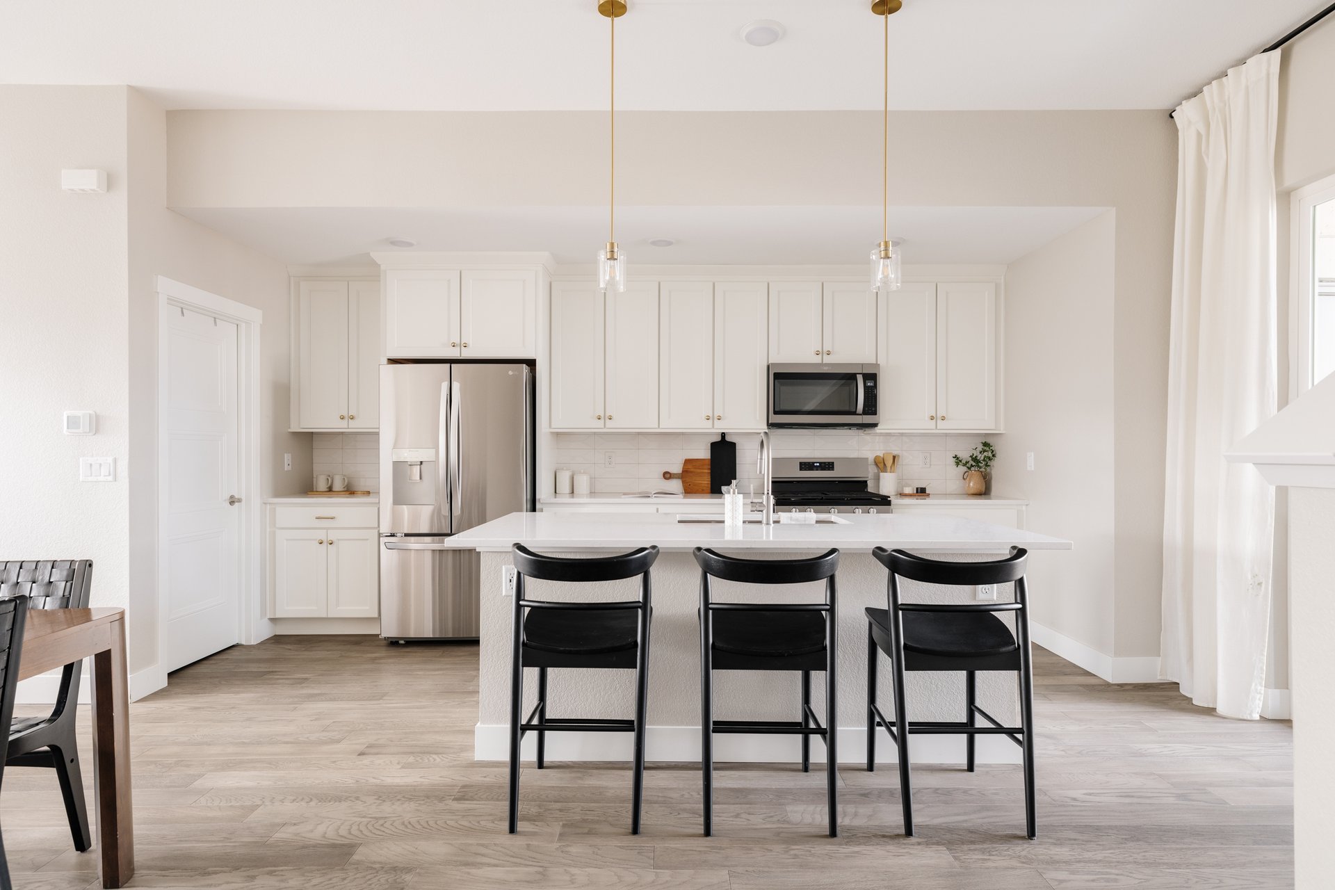 Cabinetry stacked to the ceiling, sleek quartz countertops, and a walk-in pantry elevate both style and storage, while updated hardware and designer lighting reflect the home’s top-tier design package. Engineered hardwood floors add warmth and sophistication, tying the space together with a modern, elevated aesthetic.