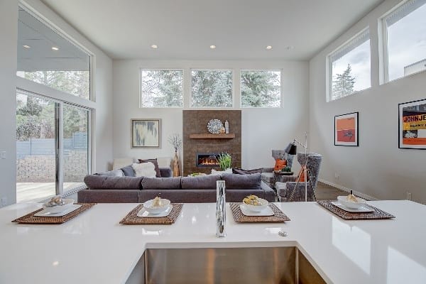 The sleek, modern style continues throughout the rest of the home, which also includes a home office area with built-in desks and a lower-level bonus room. An attached garage with room for three vehicles is an another added amenity.