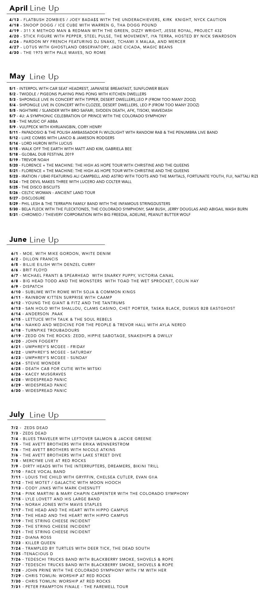 It’s that time of year again – Red Rocks Season. The Line Up is out and I wanted to share it with all of you. Make sure to book your shows before they’re all sold out. If you are looking to avoid the hefty online convenience fees of $16.95 this year - I have a money saving trick to share. Stock up on tickets at the Denver Coliseum or the Red Rocks Box Office. You can buy up to 4 tickets at once at the Coliseum and there are no fees, you buy them strictly at face value. The amount you’ll pay in online convenience fees for 3 tickets equals could buy you another ticket. The Coliseum is open on Saturdays from 2 to 4 for ticket purchases and the Red Rocks Box Office is open 2 hours before a show.