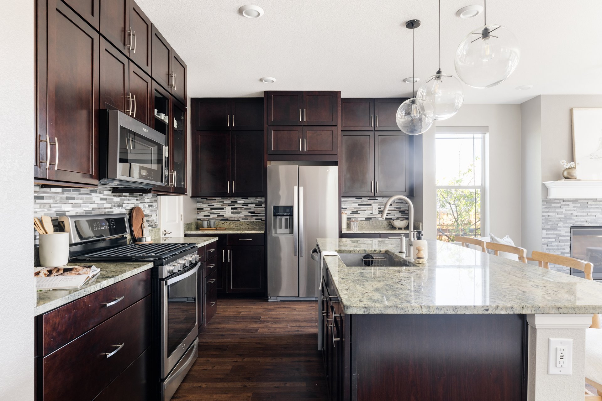 The home opens into a light-filled living space anchored by a gas fireplace with a stacked stone surround, creating both a visual focal point and an inviting atmosphere. The kitchen is designed with both everyday living and entertaining in mind, featuring espresso cabinetry stacked to the ceiling for exceptional storage, granite countertops, stainless steel appliances including a gas range, and a generous center island that naturally becomes the hub of the home. The seamless connection between the kitchen, dining, and living areas enhances flow and functionality.